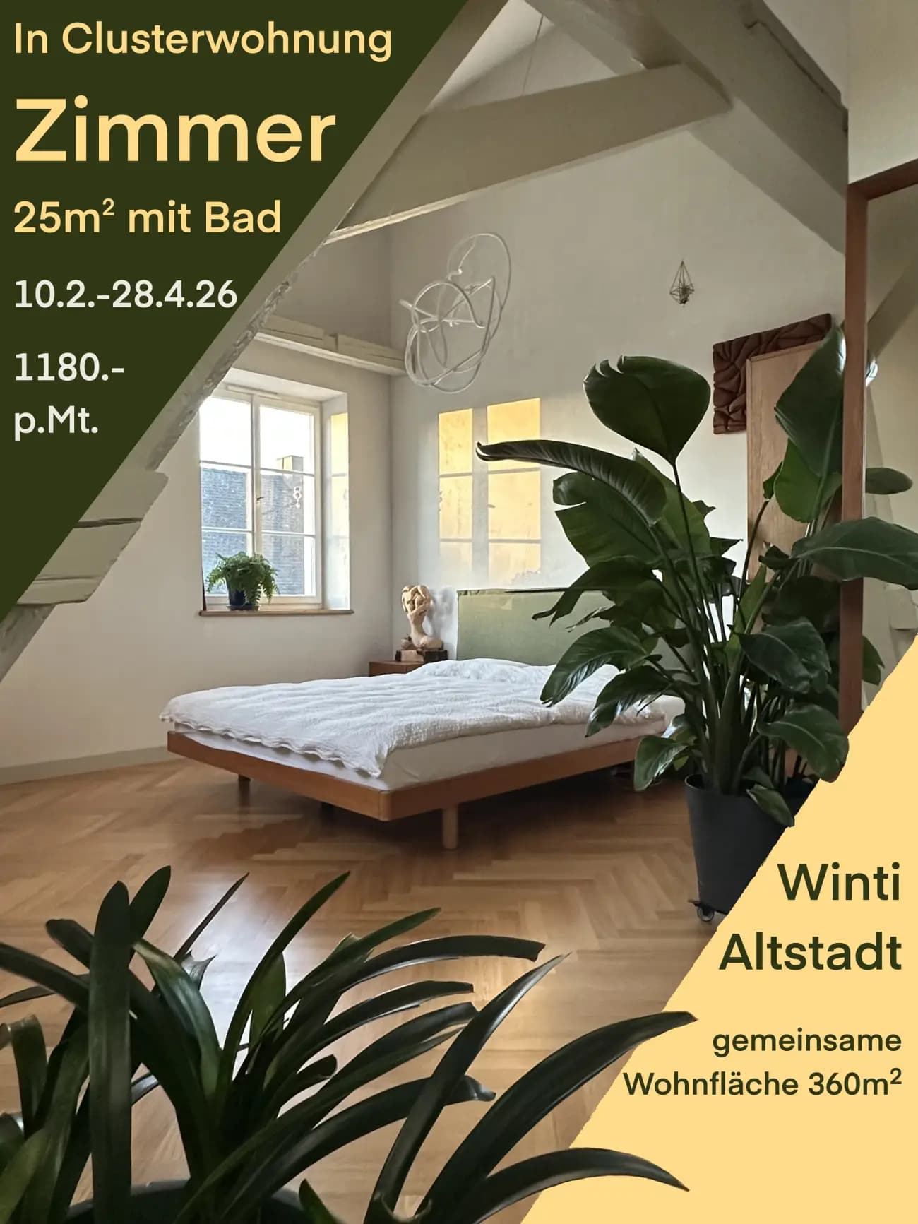 Available FebruaryAvailable from 01.02.20262 weeks onlineonline.since 2 weeksWir sind eine sportliche, offene und humorvolle 4.5 Zimmer-WG im ruhigen Wohnquartier nahe Bahnhof Winterthur.no preference for women or menshared wifi