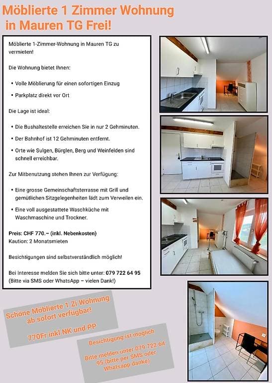 Available DecemberAvailable from 01.12.20252 months onlineonline.since 2 monthsIm Mietzins enthalten, alle Nebenkosten wie Strom, Heizung, Wlan, Serafe, Abfallsäcke u.s.w.shared wifiparking spots available for use/rent