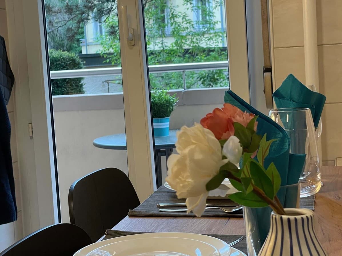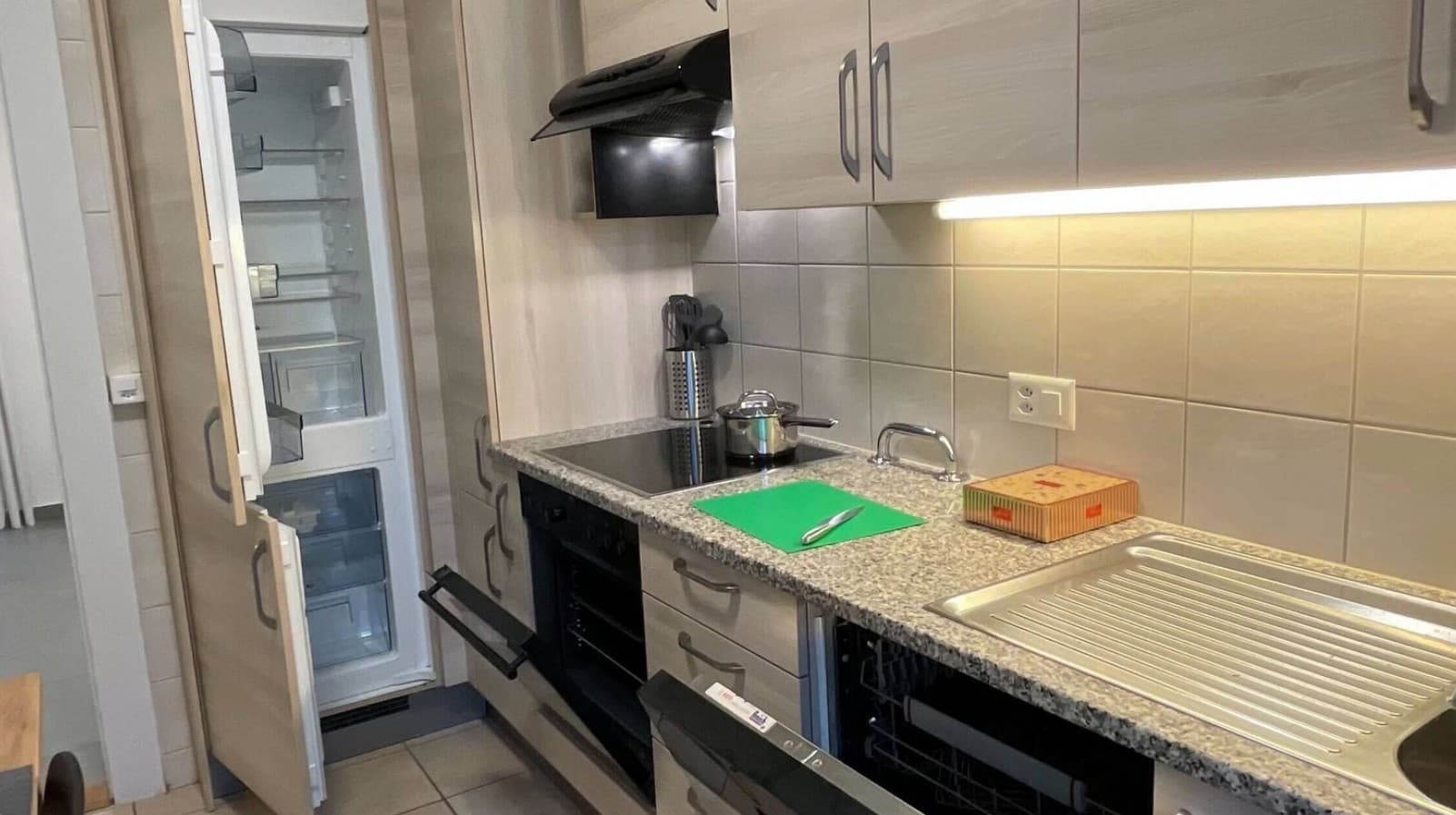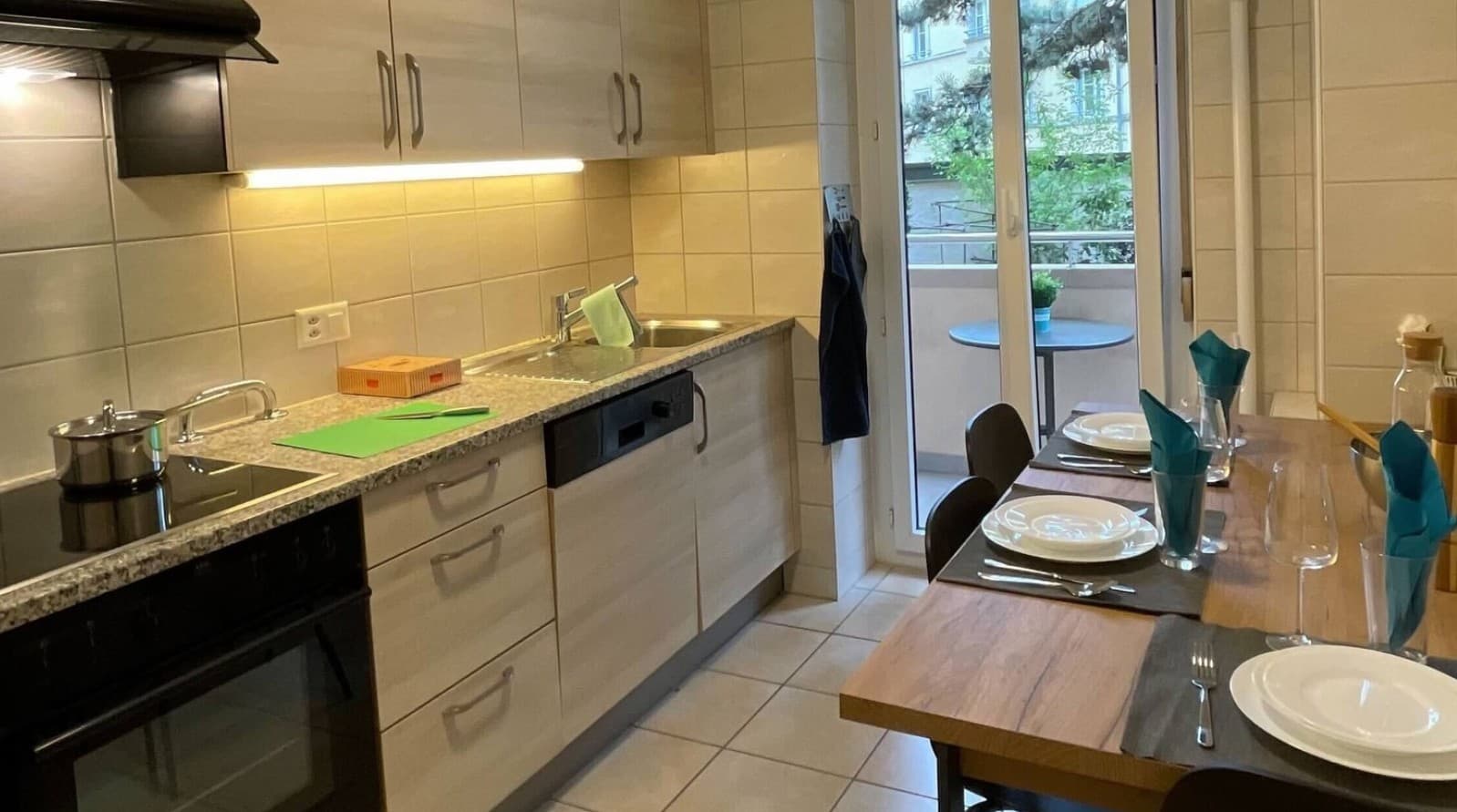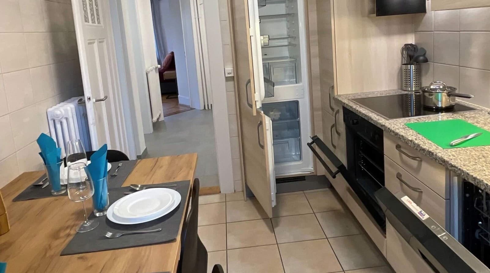 La cuisine est également entièrement équipée avec tous les ustensiles nécessaires. Nos meubles, neufs et choisis avec soin, contribuent à l'ambiance accueillante de l'appartement.