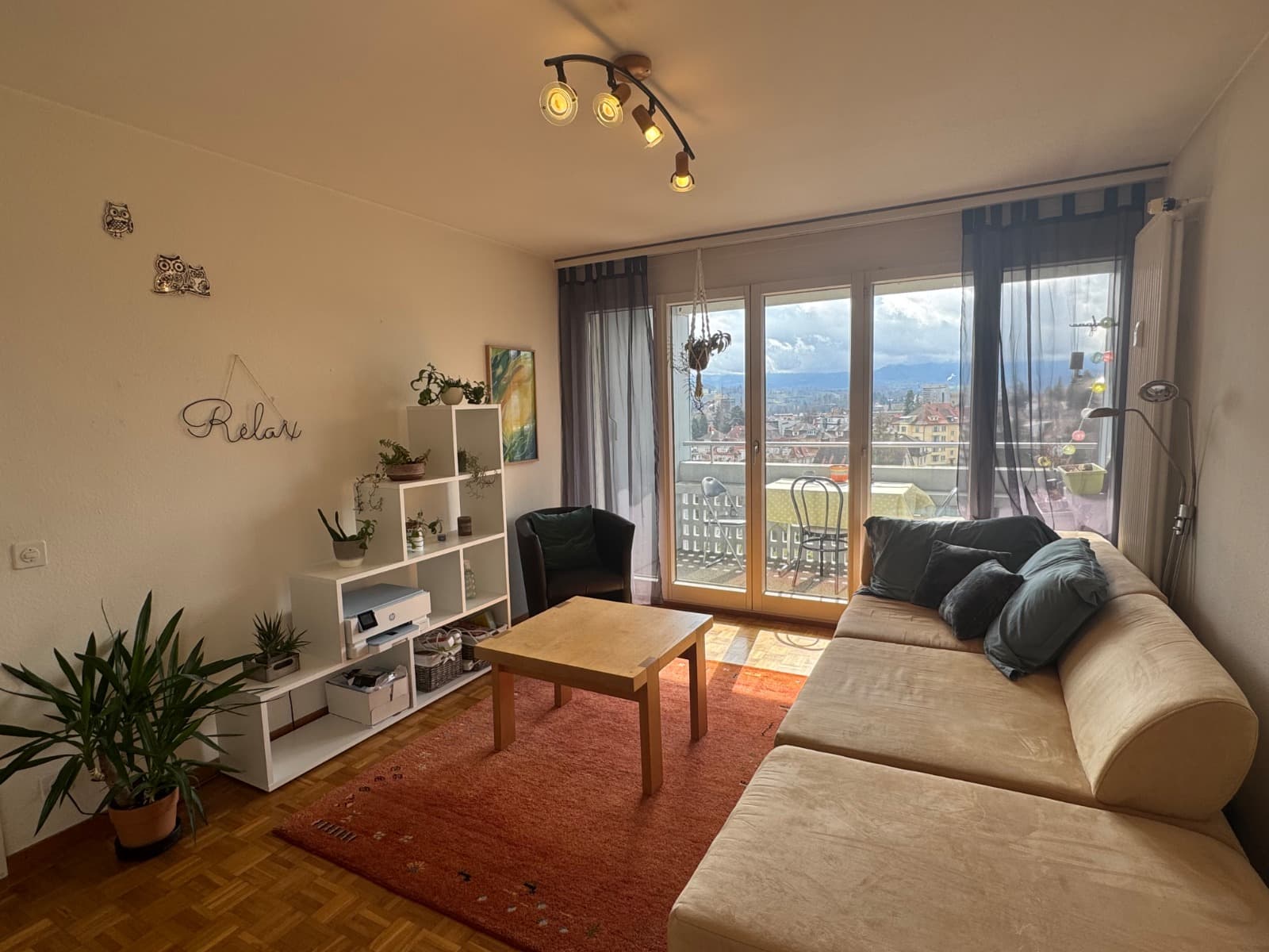 Es ist 12 m² gross, unmöbliert und bietet einen schönen Blick über die Stadt, auf die Berge und ins Grüne – ein angenehmer Ort zum Entspannen nach einem langen Tag.