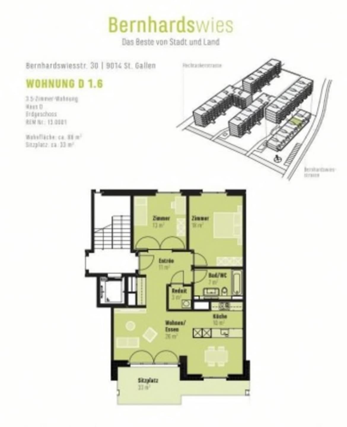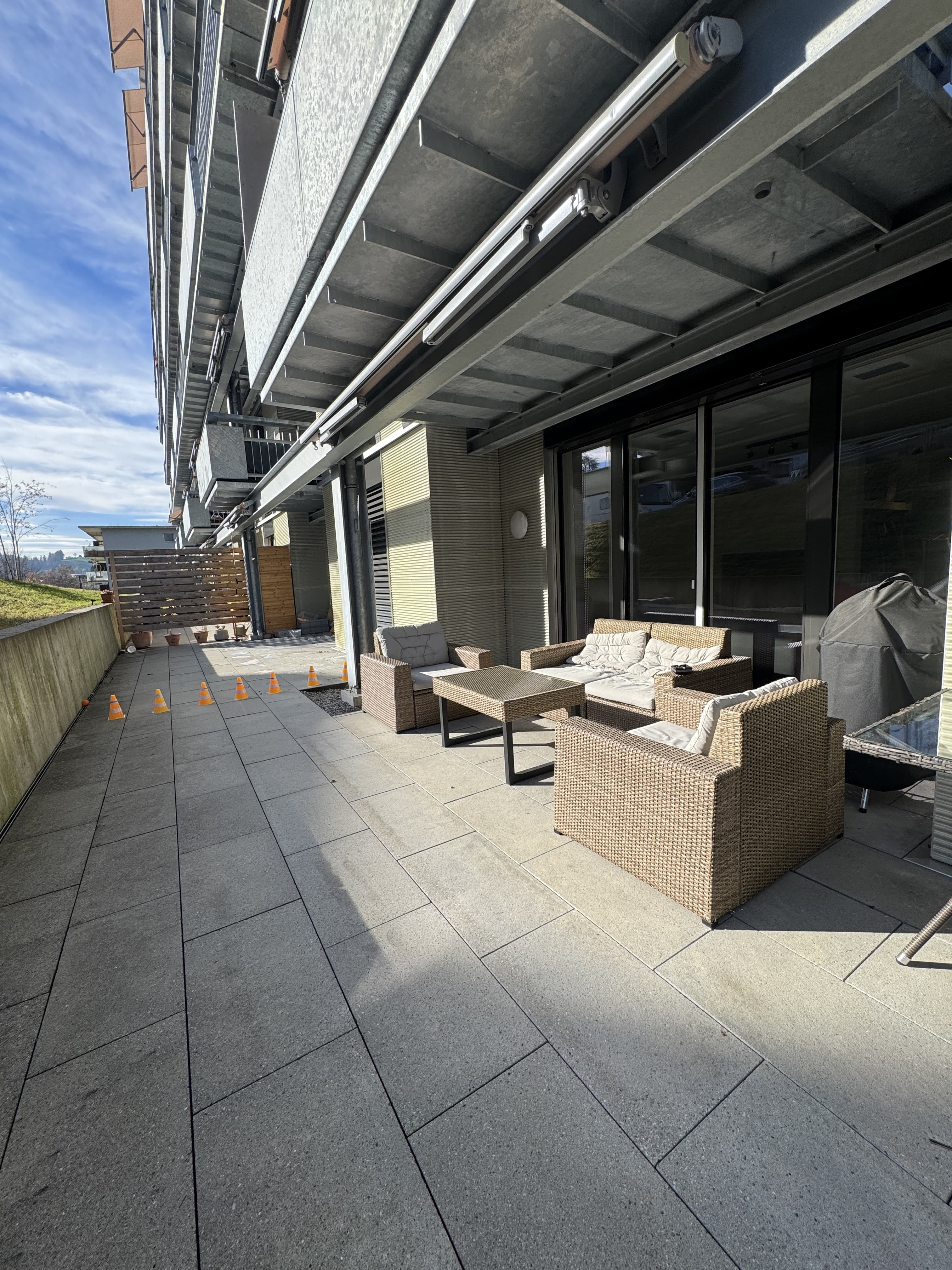 Die Wohnung ist 88 m² groß, modern (Minergie-Standard), hell und verfügt über eine offene Küche, eine Terrasse sowie Waschmaschine und Tumbler in der Wohnung.