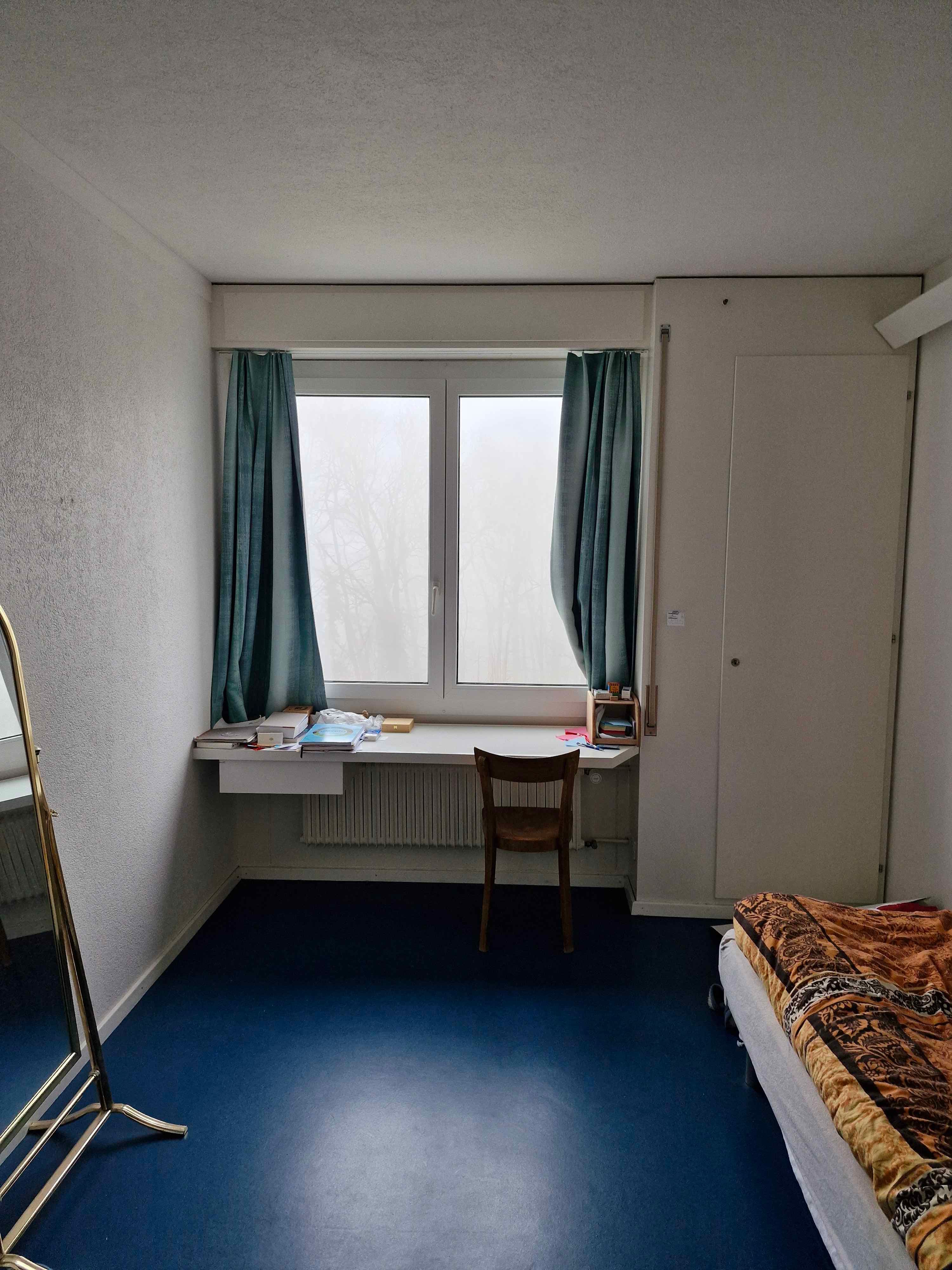 Das Zimmer ist etwa zwischen 12 und 13 m2 gross plus der Eingangsbereich mit eingebautem Lavabo ist nochmal etwa 2 m2 (geschätzte Fläche) (vgl. Bilder 1 und 2)