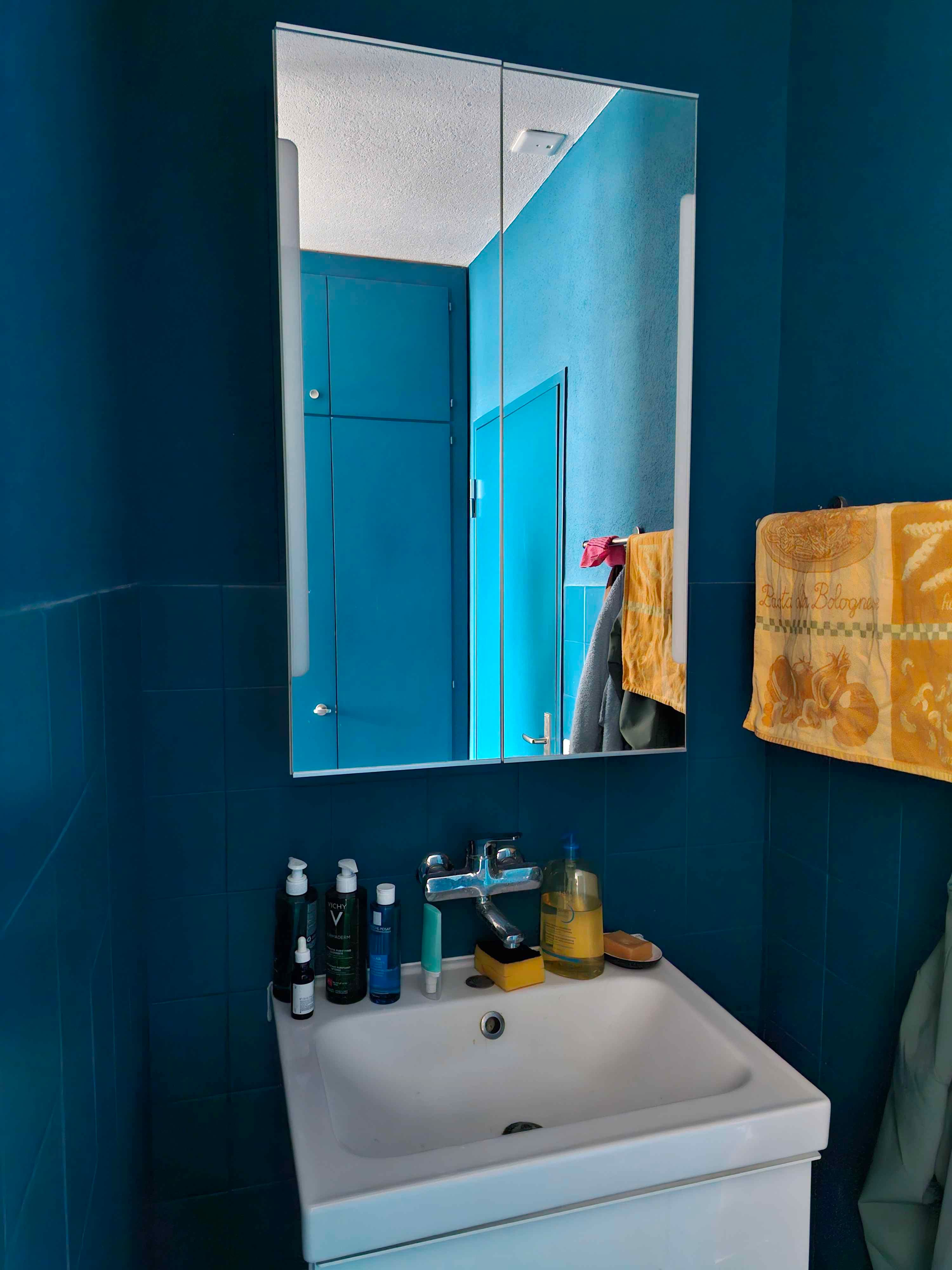 Le lavabo dispose d'un petit placard et d'un tiroir (voir photo 3).