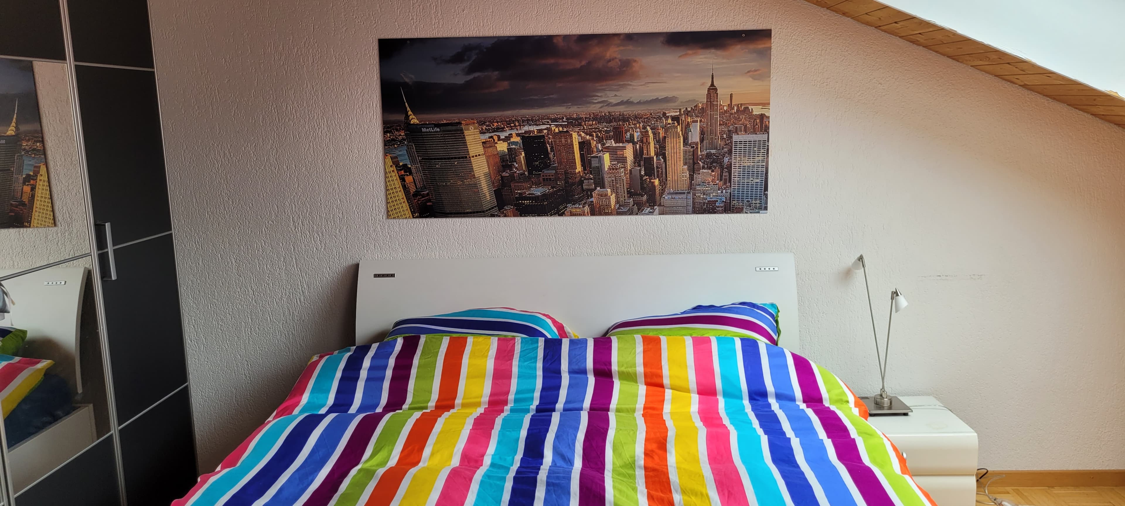 Das Zimmer ist voll möbliert: 1 bequemes Doppelbett 140 x200 cm, Kleiderschrank, Schreibtisch, Sofa und Fernseher. Die Küchengeräte sind auch vorhanden.