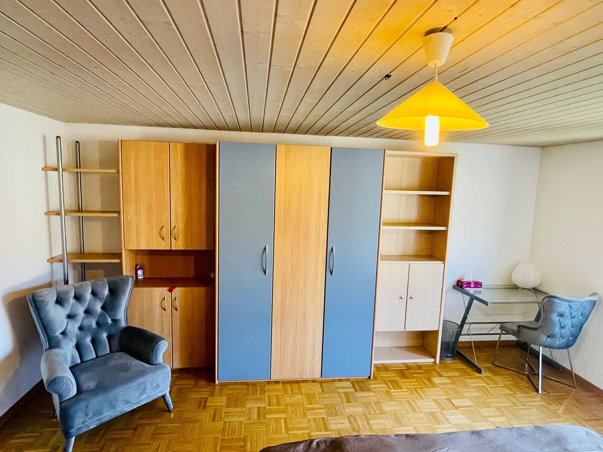 Das Zimmer ist voll möbliert: 1 bequemes Doppelbett 160 x200 cm, Kleiderschrank, Schreibtisch, Sofa und Fernseher. Die Küchengeräte sind auch vorhanden.