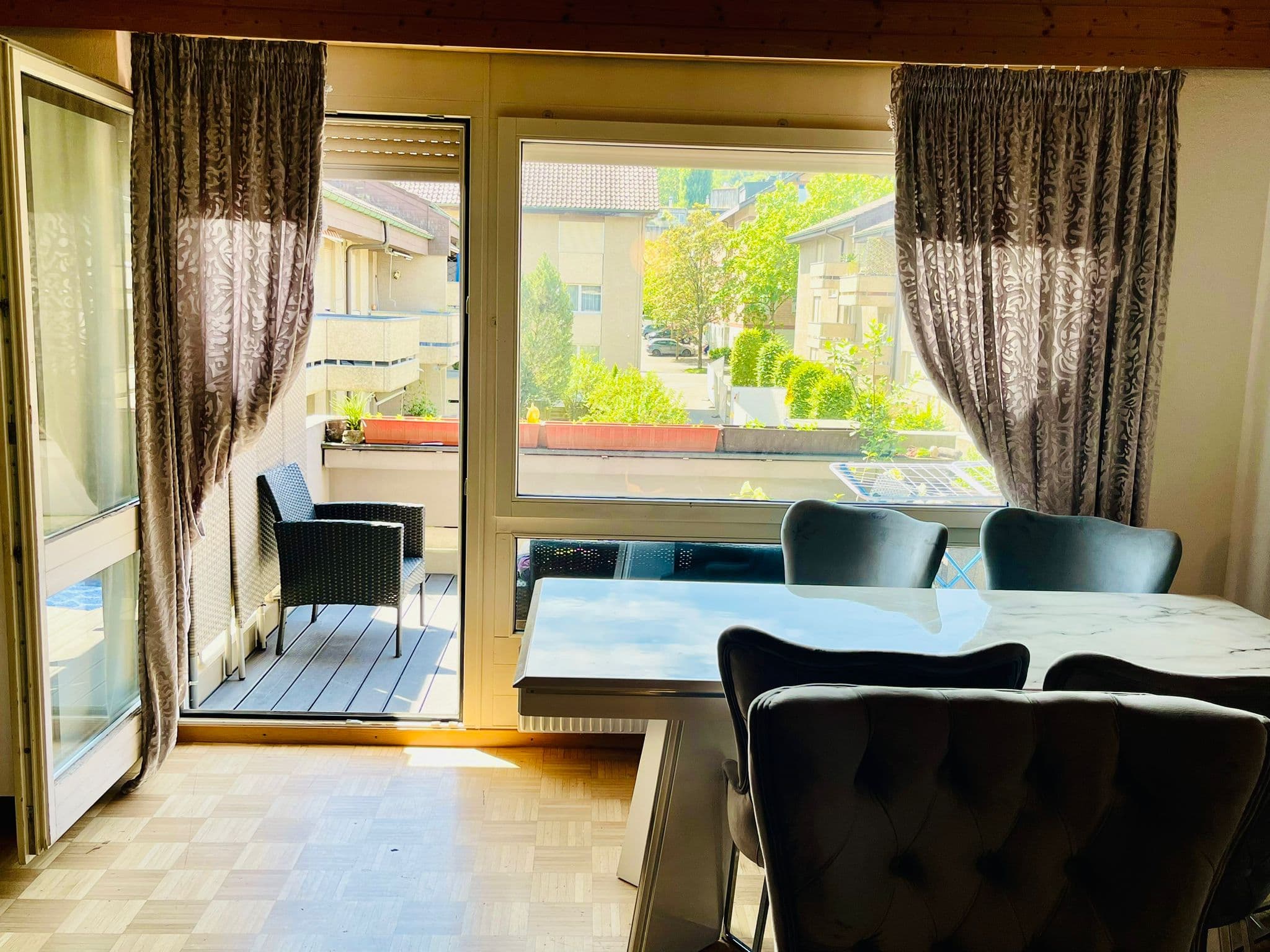 Das Wohnzimmer, Esszimmer, Küche, Dusche und Balkon werden selbstverständlich gemeinsam benutzt.