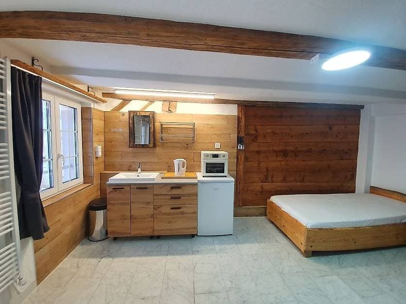 Lavabo mit Spiegelschrank, Kleiderschrank, Safe, Bürotisch, Wasserkocher, Grillbackofen, Kühlschrank, elektrisch öffnender Abfalleimer, Bett mit Matratze und Matratzenschoner