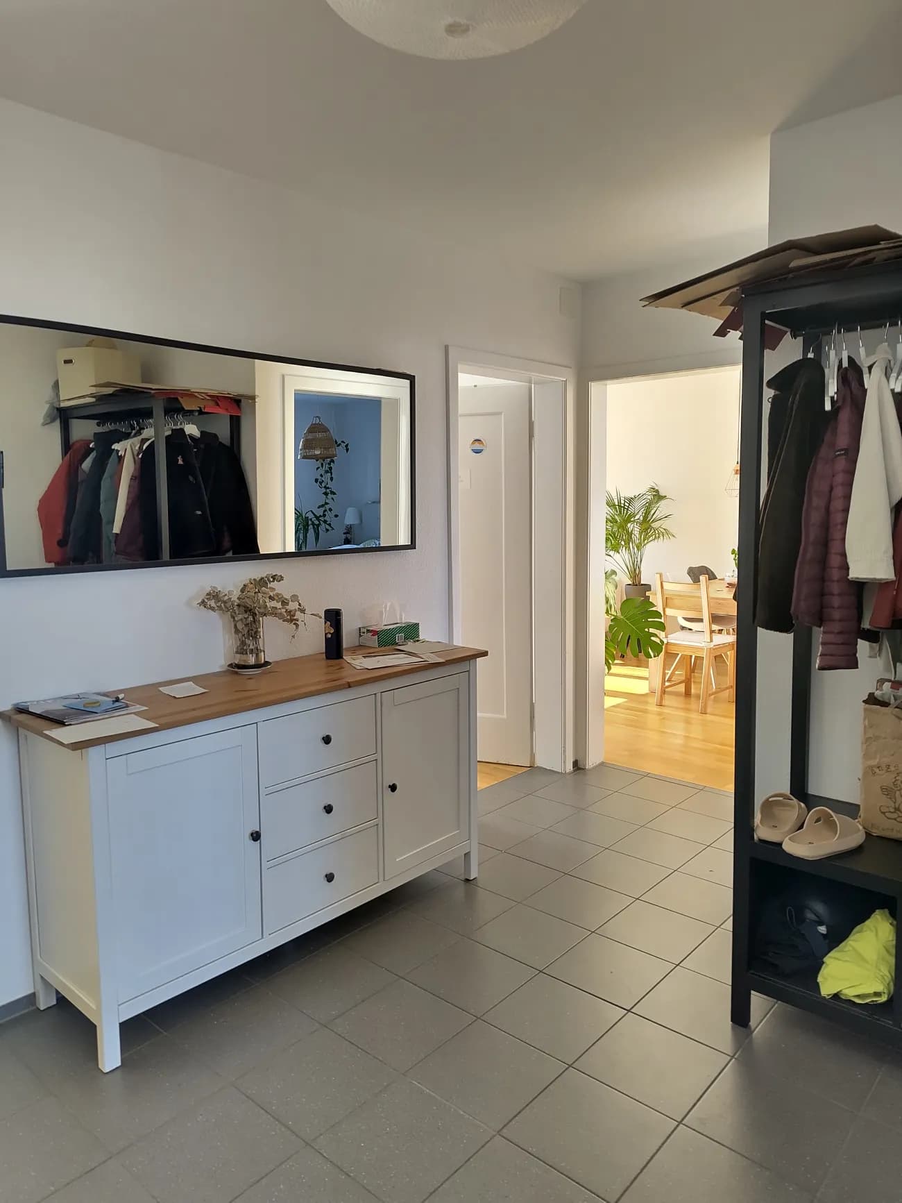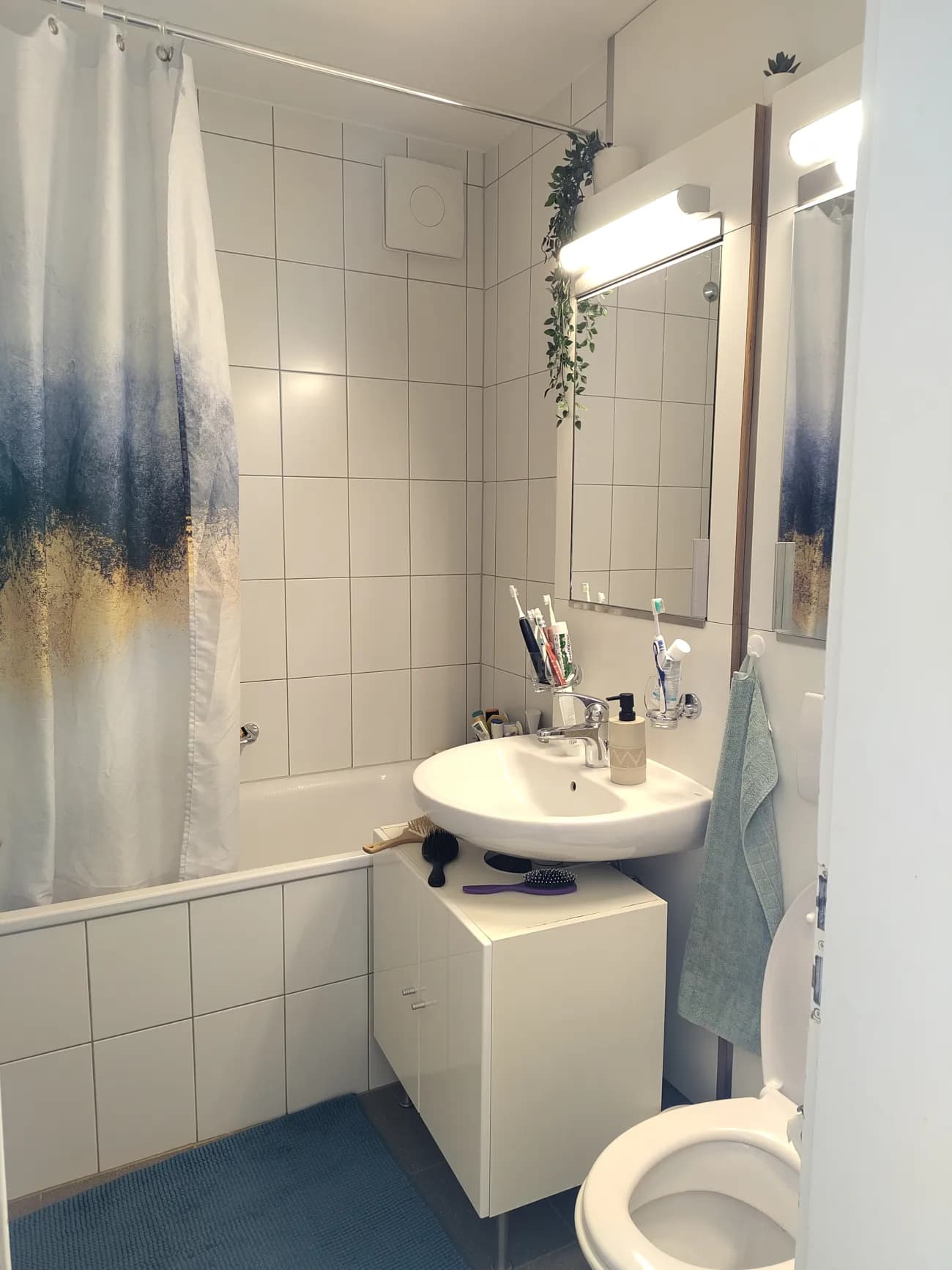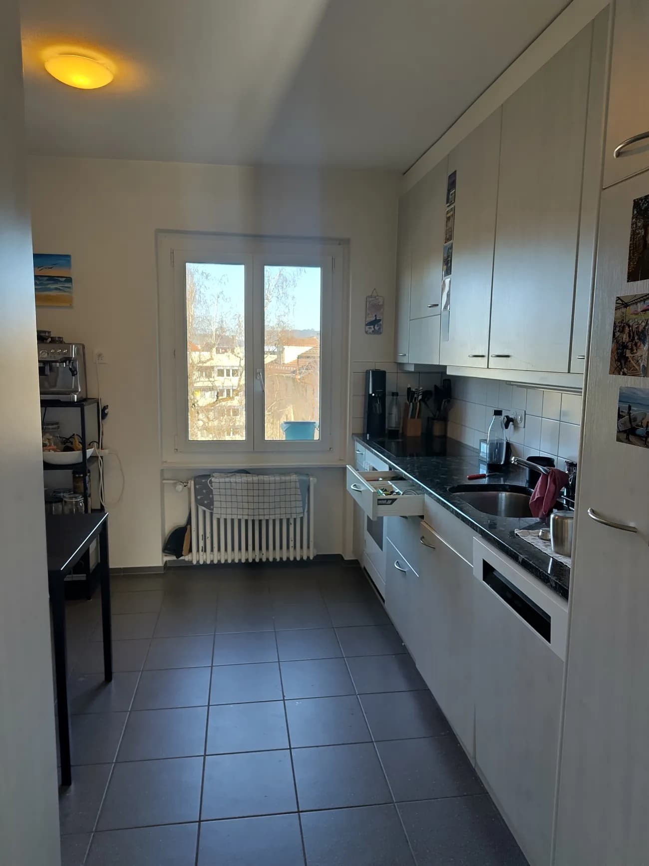 Das Wohnzimmer ist gemütlich, die Küche gross und wir teilen uns ein kleines Bad.