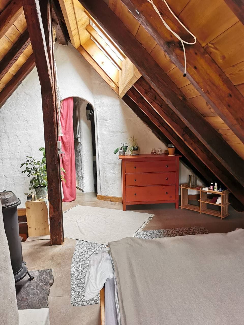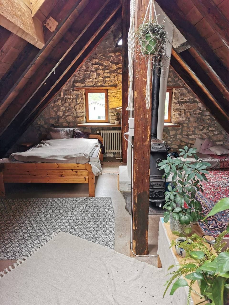 • großes, doppelstöckiges Dachzimmer (Doppelzimmer) mit Natursteinwänden & Holzofen