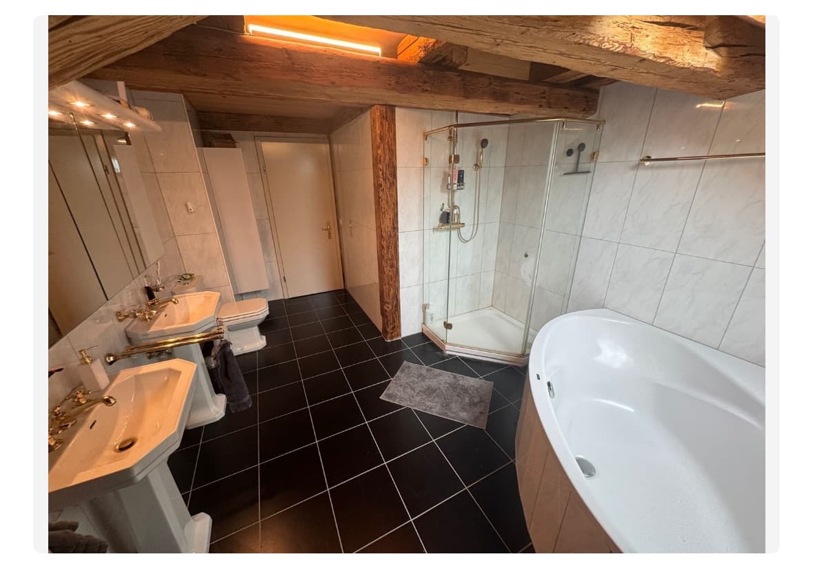 1. Stock: Zwei Schlafzimmer, ein kleines Wohnzimmer und ein grosses Badezimmer mit Badewanne, Dusche und WC.