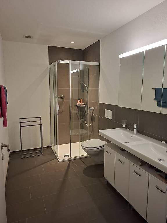 Die Wohnung hat 2 Badezimmer, eine Dusche, eine Badewanne, Waschturm in der Wohnung, seperates Zimmer zum Trocknen der Wäsche in der Wohnung, Balkon mit Aussicht ins Grüne und in die Urner Berge, Küche inklusiver einer Grundausstattung zum Kochen oder Backen. Glasfaseranschluss.