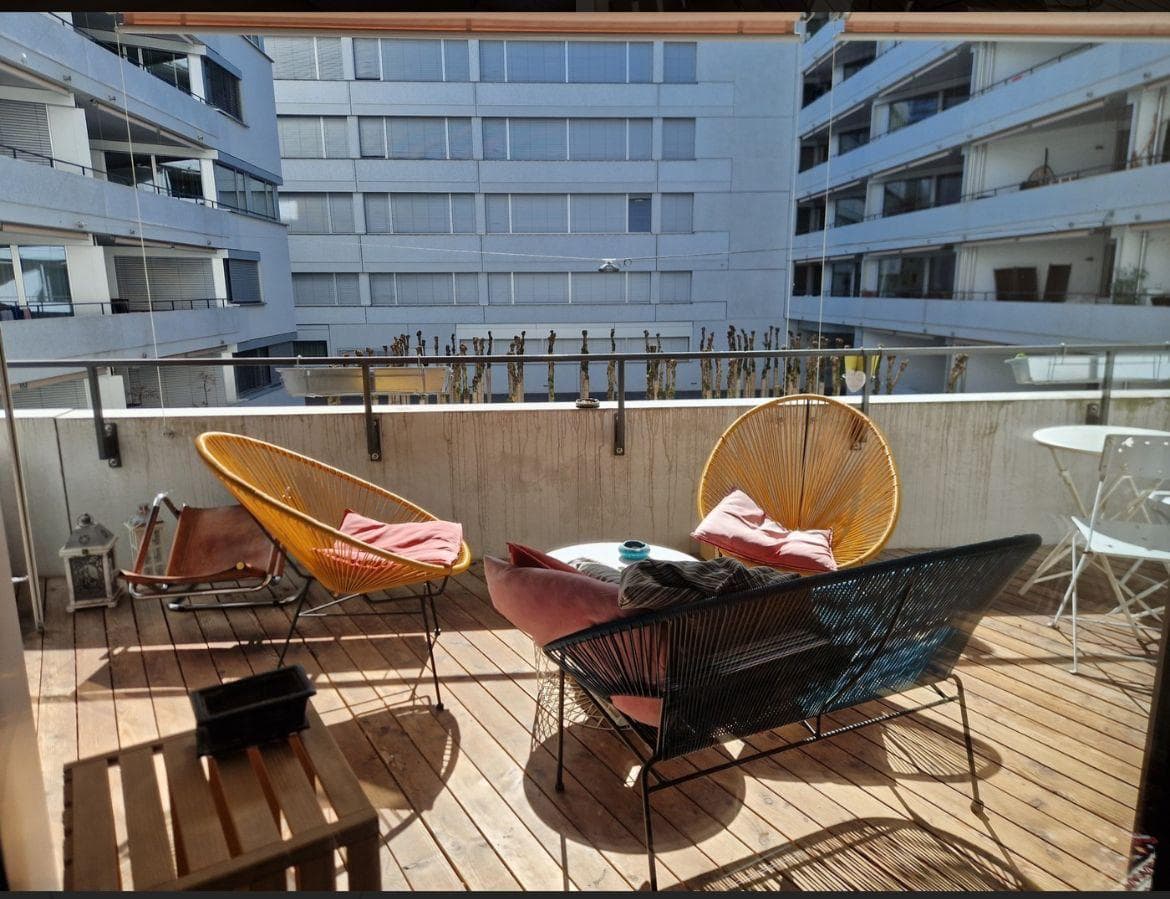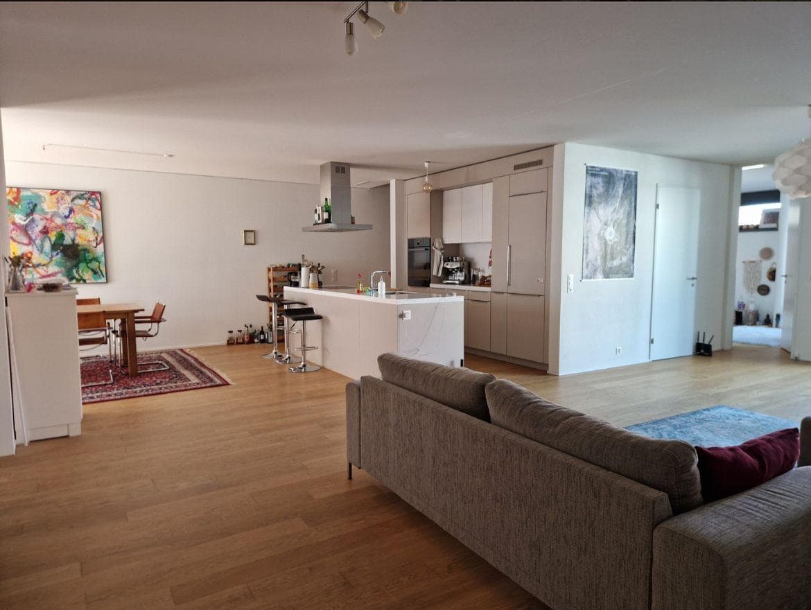 Our spacious 163 m² apartment is located near the Limmat between Escher-Wyss-Platz and Altstetten station. Two balconies (35 m²) are perfect for summer aperitifs, barbecues, and occasional parties. The open living and kitchen area is ideal for social evenings. A washing machine, dryer, and bike parking are available.