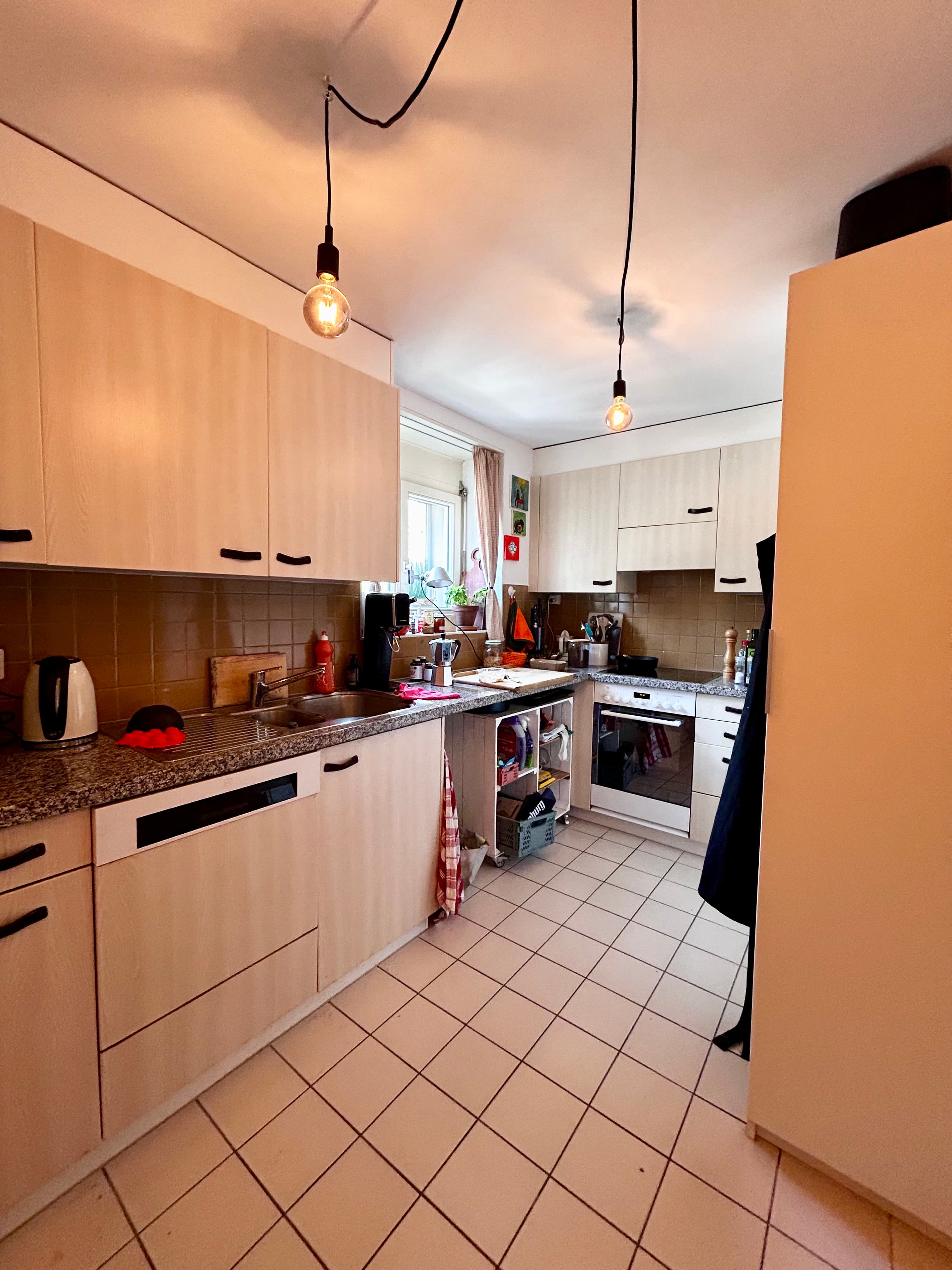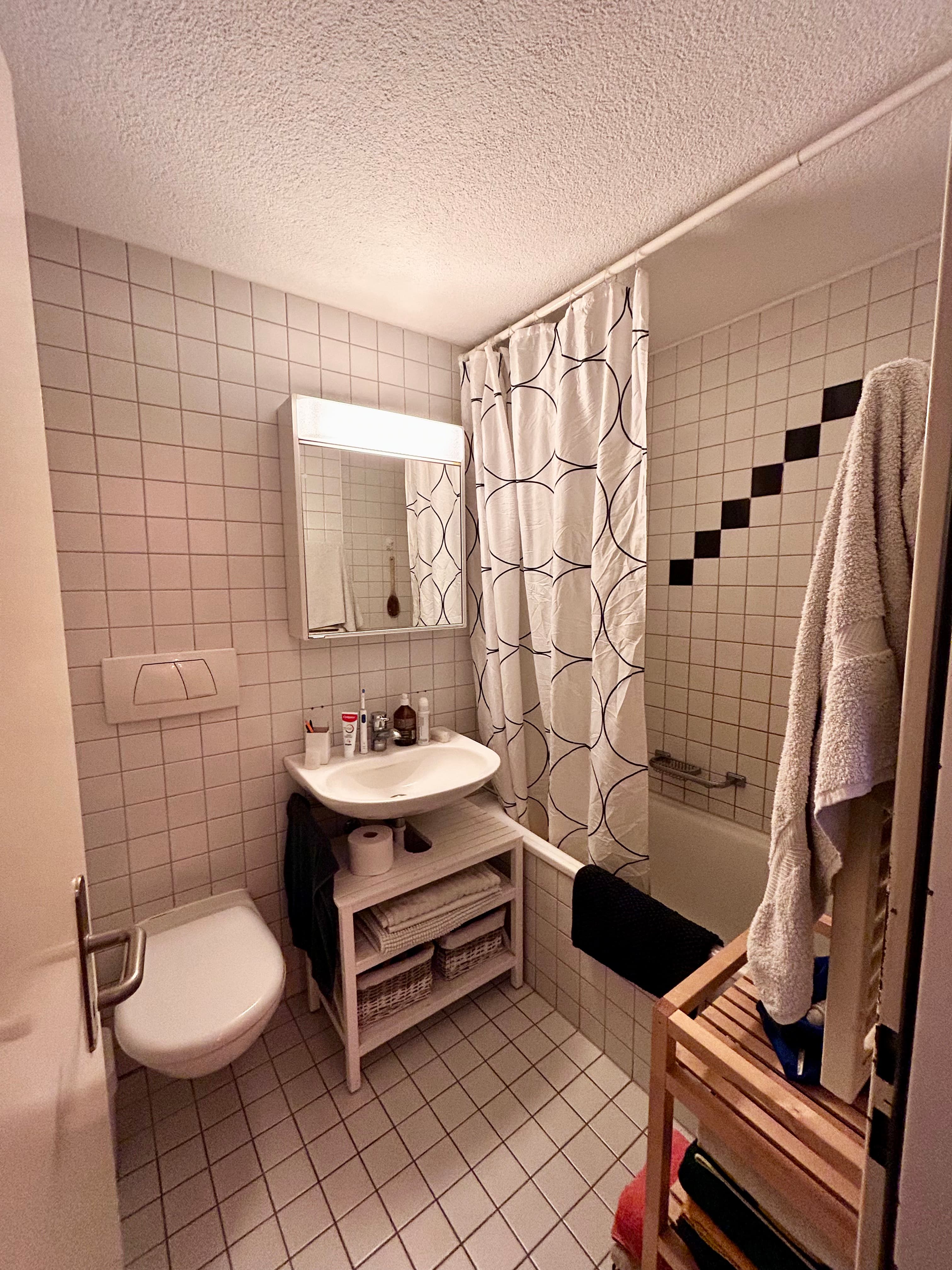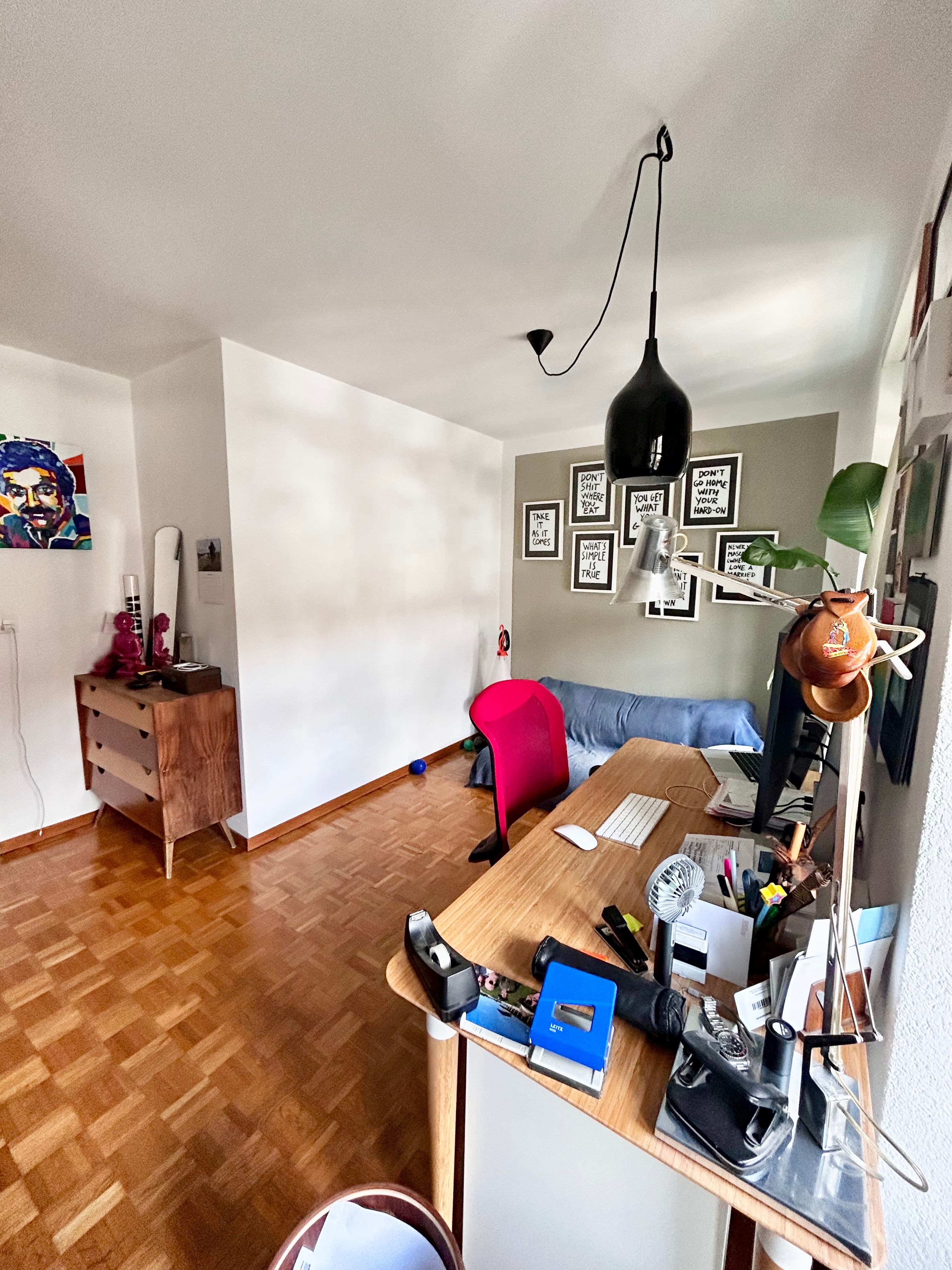Das Zimmer ist ca. 13 m² gross, teilmöbliert mit Futon, Kommode, Nachttisch und Lampen sowie eigenem Balkon mit Abendsonne. Es liegt ruhig zum Innenhof. Küche, Wohnzimmer und Bad werden gemeinsam genutzt.