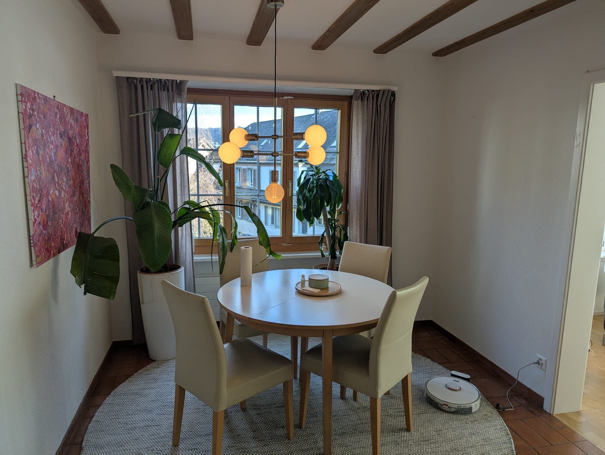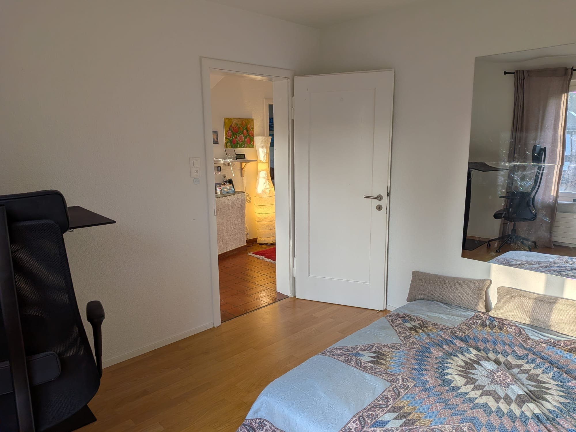 Du ziehst in ein privates Zimmer in einer hellen, gepflegten 3,5-Zimmer-Wohnung ein, die vom Wohnzimmer aus einen Blick auf die Alpen bietet. Dein Zimmer kann wahlweise möbliert oder unmöbliert übernommen werden.
