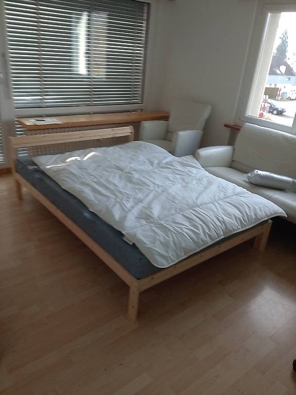 Im Zimmer hat's Bett Bürotisch Bürostuhl Bettwäsche und Schrank.