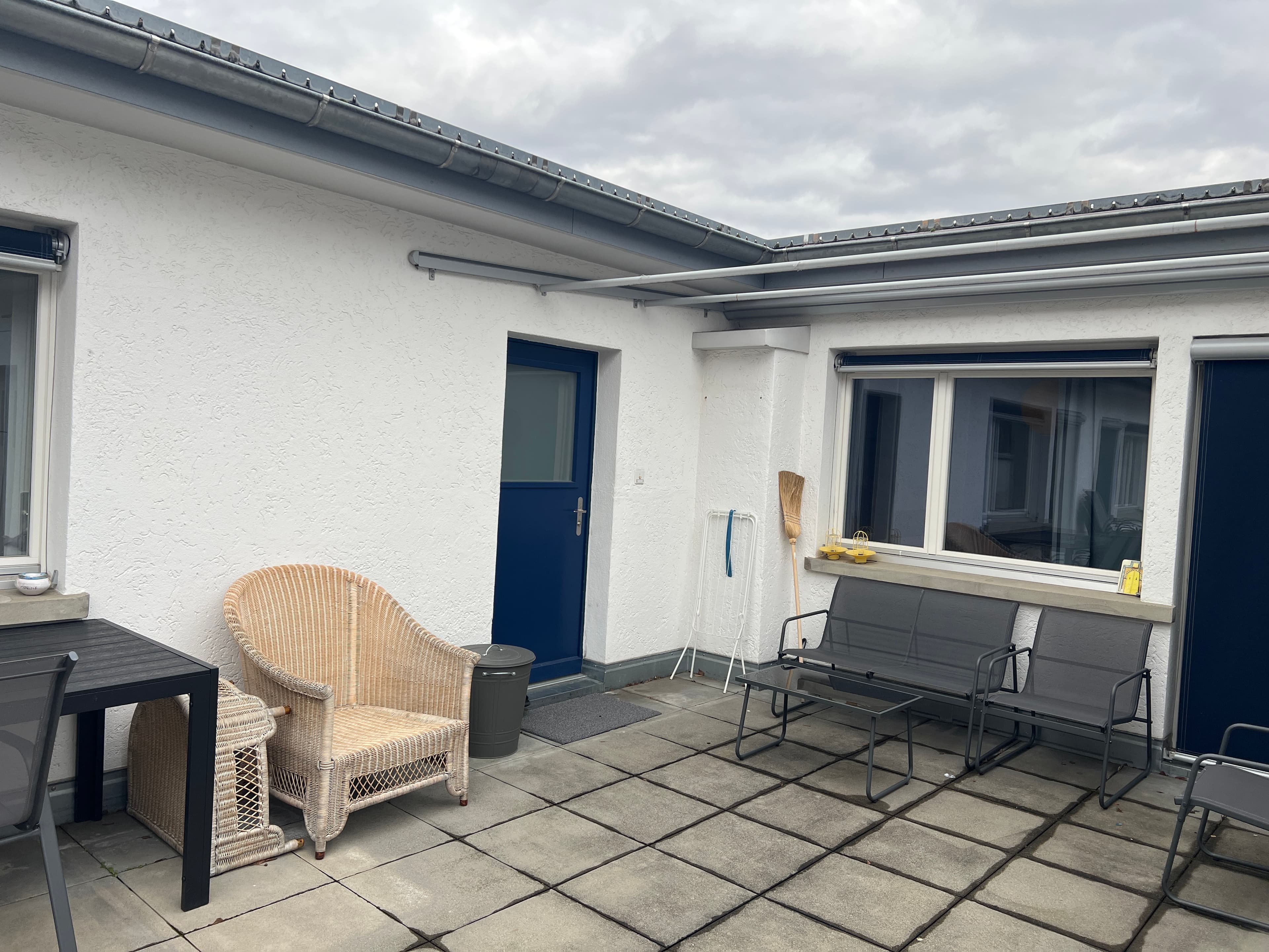 die riesige Terrasse (ca. 76 m²), perfekt für Kaffee in der Sonne, Lesen, Gespräche oder einfach mal Luft holen.