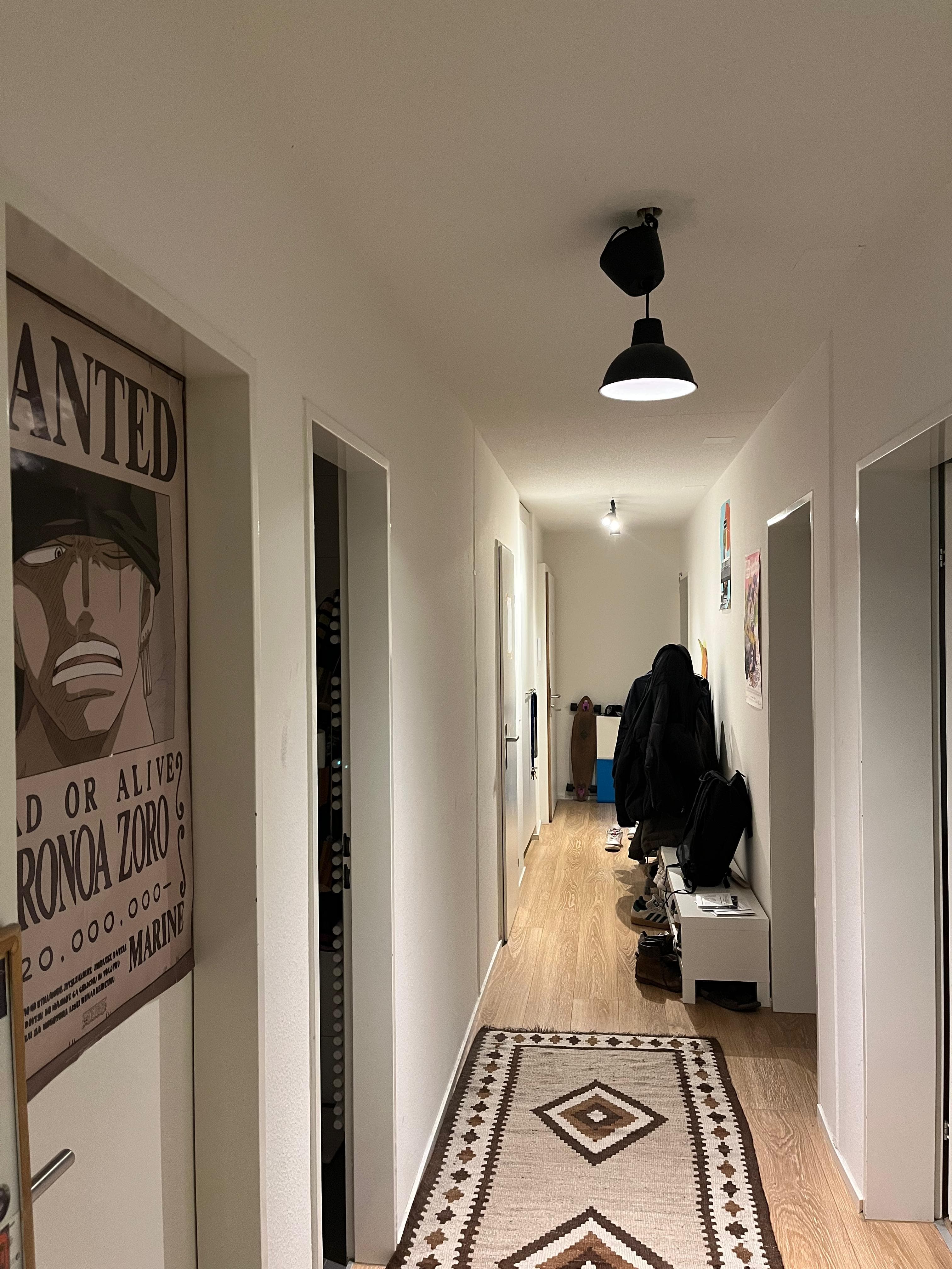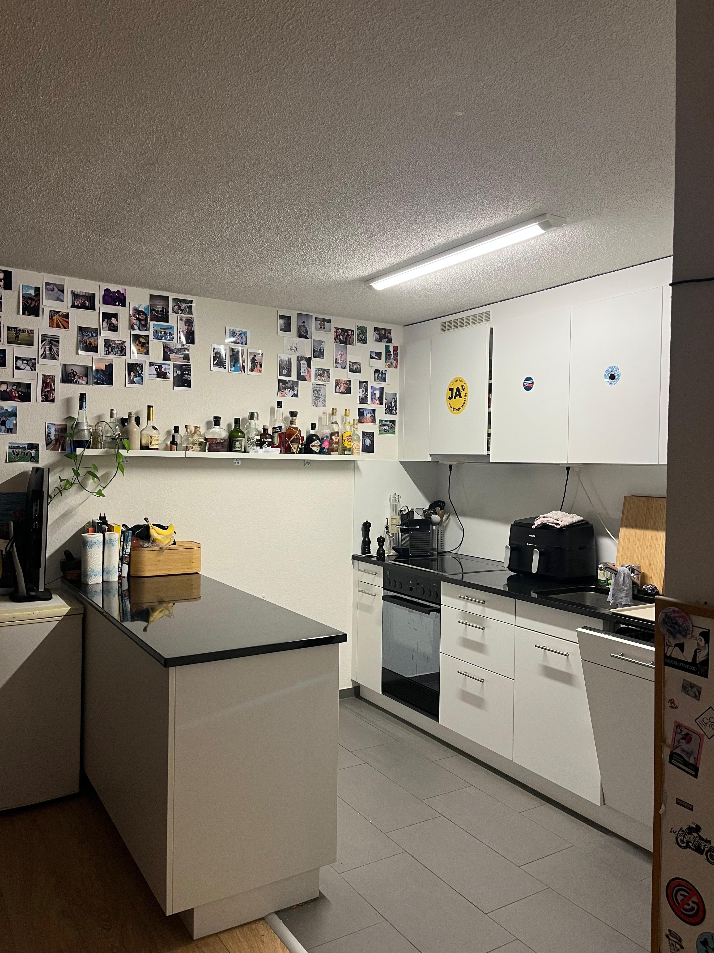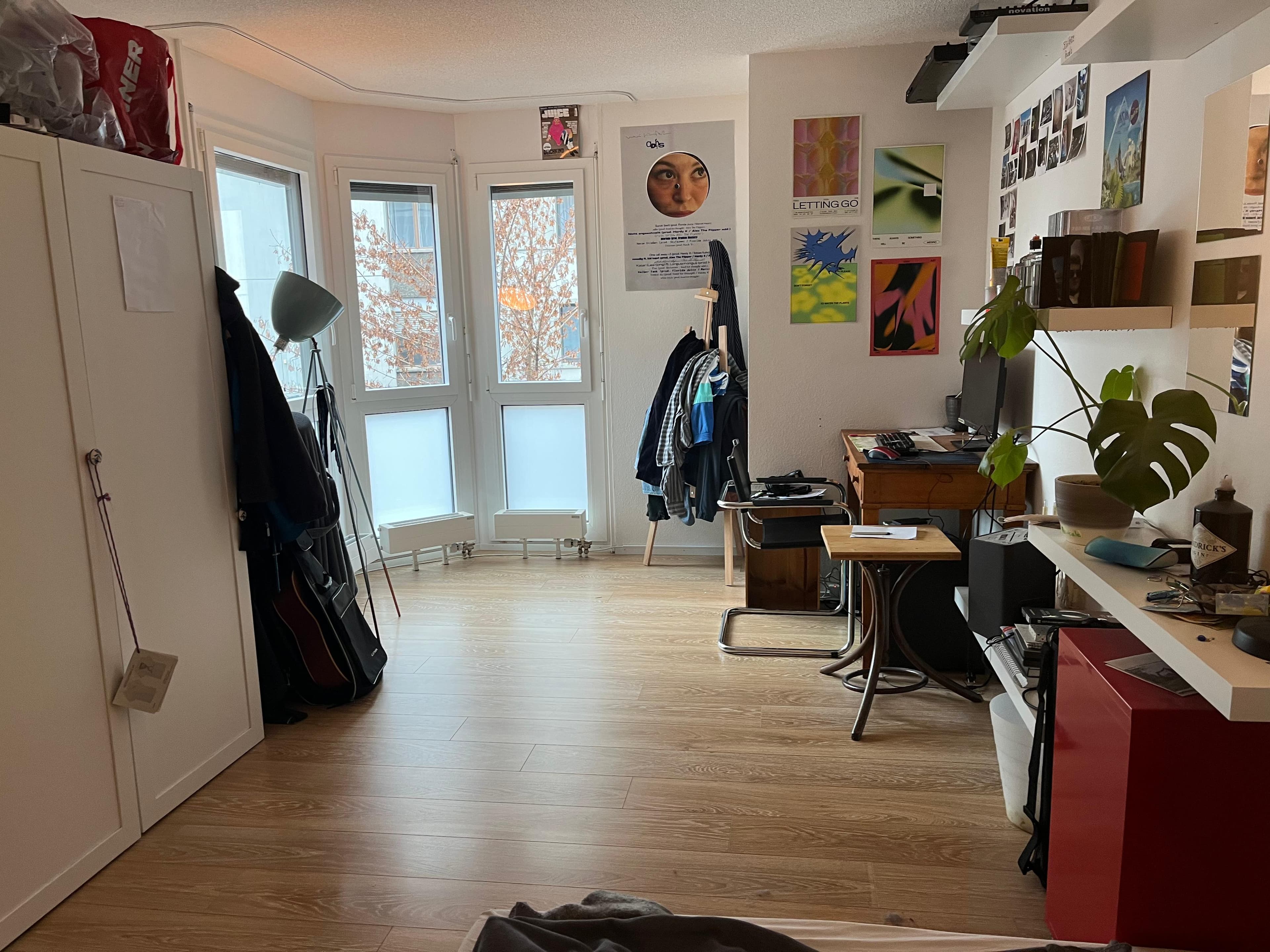 Zimmer: Helles mit einer Fensterfront über eine Ecke. Das Zimmer ist gross (17 m2) und hat einen kleinen Erker. Die Wohnung (2016 renoviert) hat ein neues Bad mit WC/Dusche und ein separates WC. Einen Balkon, neue Küche mit Kücheninsel. Das Zimmer ist unmöbliert, der Rest der Wohnung ist möbliert.