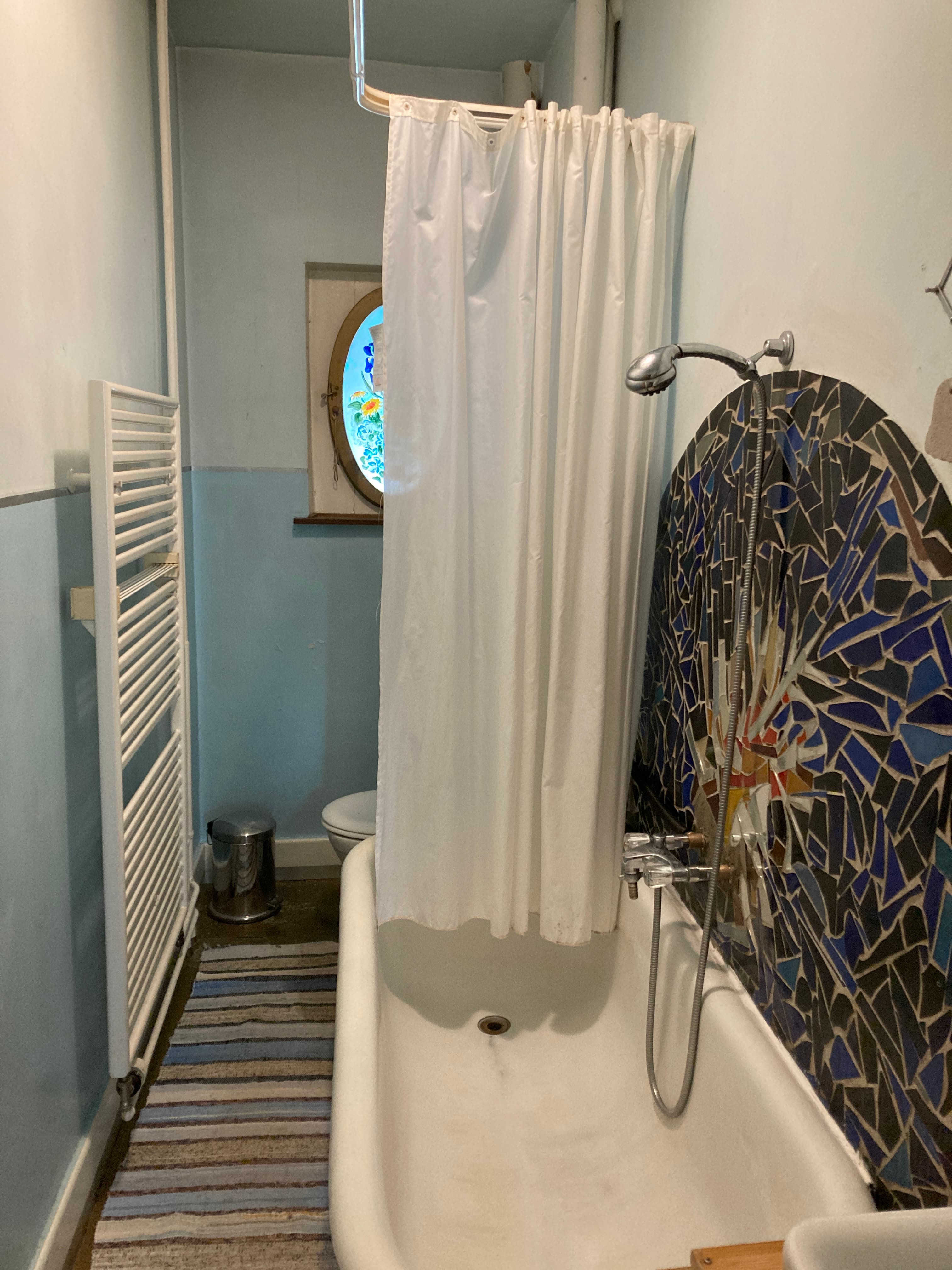 Küche mit Gasherd, Kühlschrank, Esstisch und Bad mit WC, Badewanne und Dusche sind zur gemeinschaftlichen Nutzung.