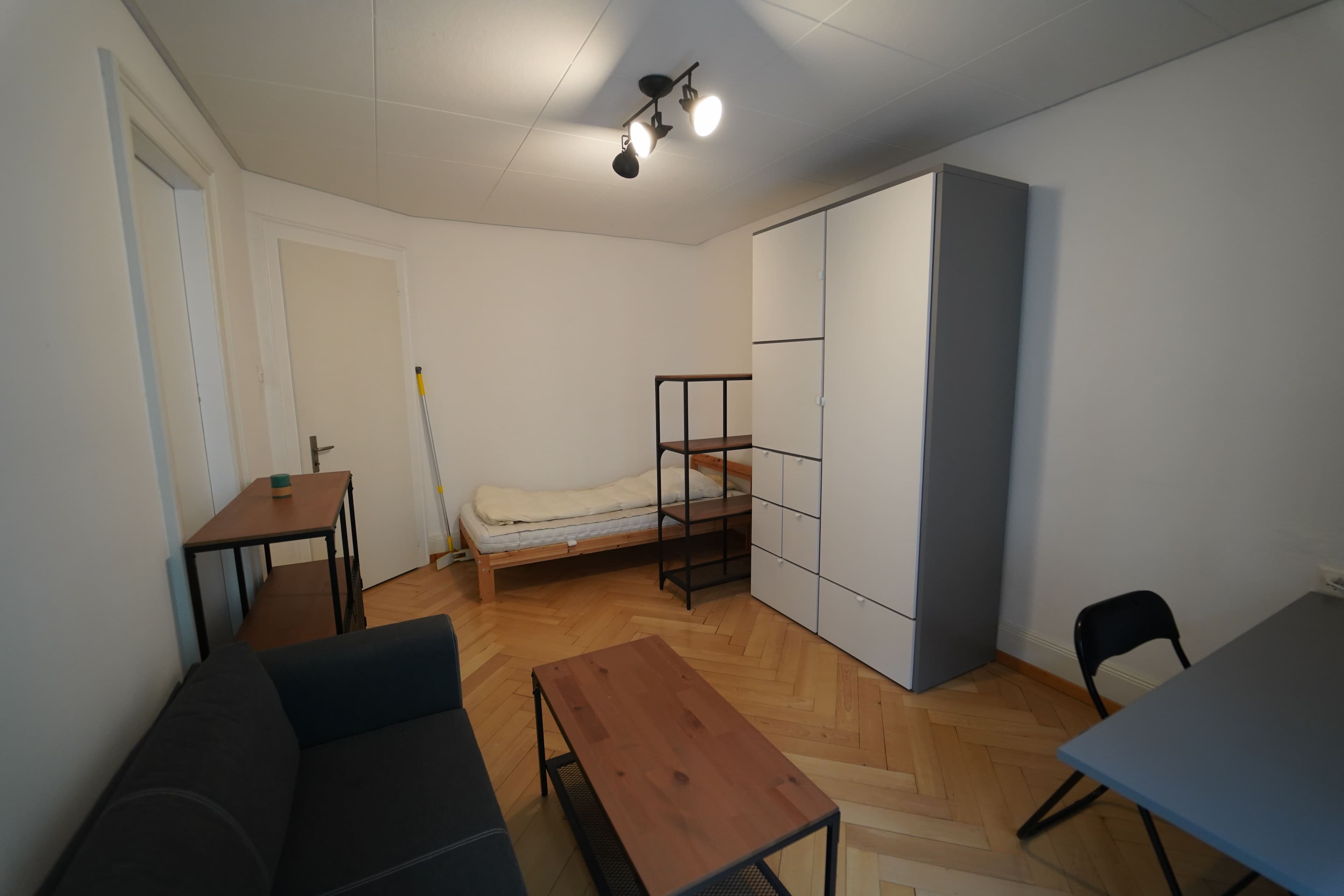 • Möbliert: Sofa, Tisch, Regale, Schrank und Bett (siehe Fotos)