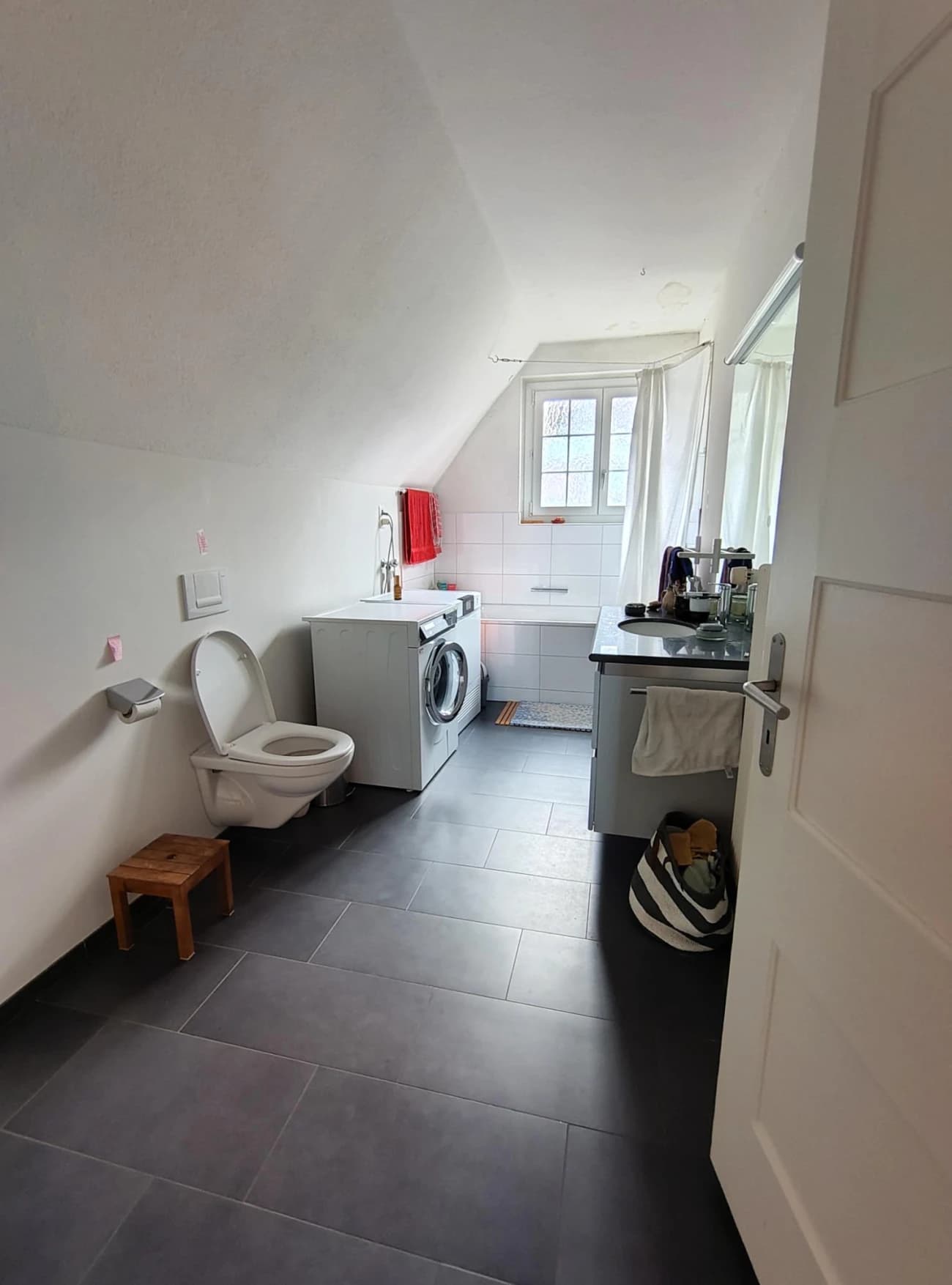 Zudem haben wir eine eigene Waschmaschine und Trockner in der Wohnung, zwei Badezimmer und auch sonst fast alles, was eine Wohnung praktisch macht.