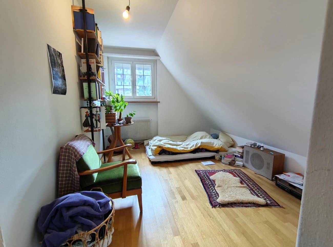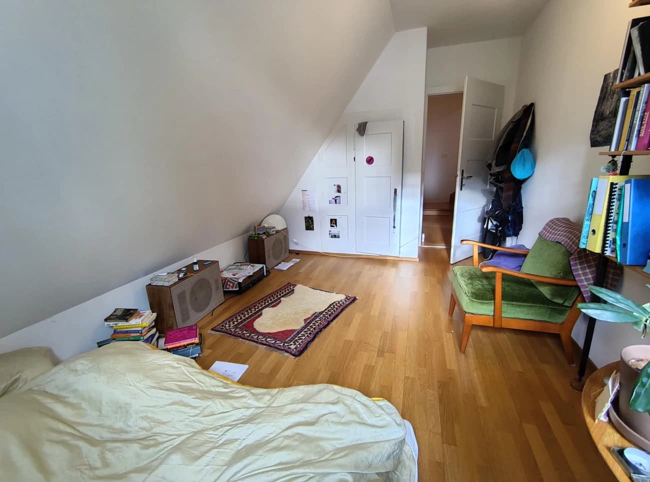 Dein Zimmer ist eher klein, dafür mit gemütlicher Dachschräge, Einbauschrank und einem zusätzlichen Schrank im Gang. Es ist sehr ruhig, hat ein Fenster gegen Süden und tolle Zimmernachbarn.