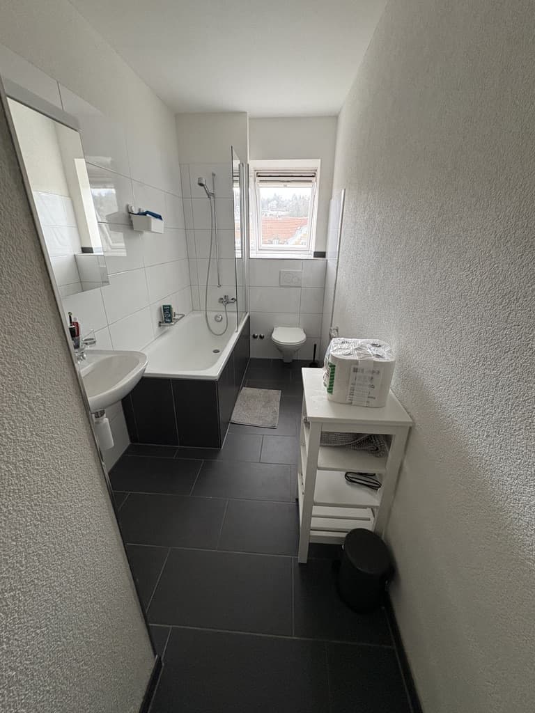 Das Bad verfügt über eine Badewanne mit Duschfunktion, ein Waschbecken mit Spiegelschrank sowie ein WC. Es wird gemeinschaftlich genutzt und ist gepflegt. Zusätzlich gibt es eine Waschmaschine und einen Trockner zur Mitbenutzung in der Wohnung bzw. im Haus.
