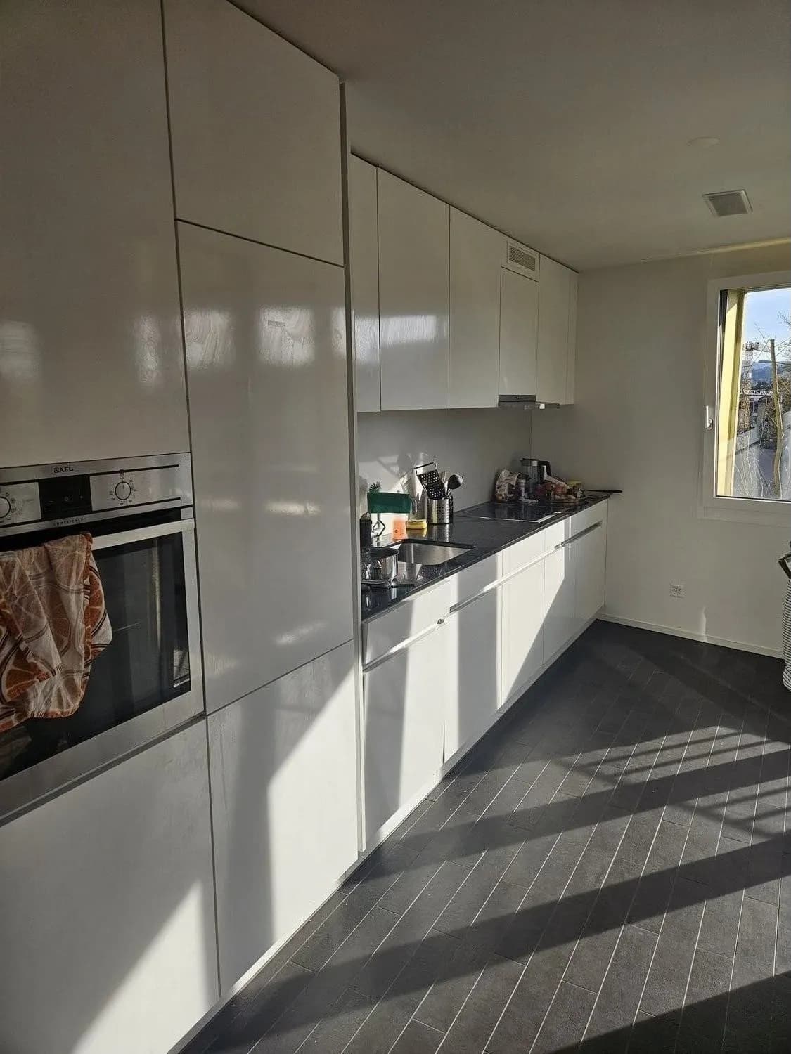 Die Wohnung ist modern und ca. 105 m² gross (zzgl. Balkon). Eine grosse Fensterfront im Küchen- und Essbereich lässt die Abendsonne den gesamten Wohnraum durchfluten.