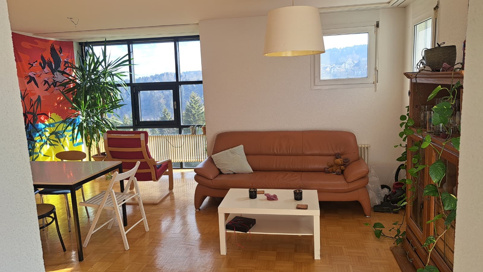 Das Zimmer hat 16qm und ist etwas länglich geschnitten. Besonders schön: Aus dem Fenster kann man den Bodensee sehen! Die gesamte WG ist 98qm groß und wird von insgesamt drei Personen bewohnt. Dein WG-Leben wirst Du mit zwei Schweizer Studis teilen (21, 24). Die WG-Sprachen sind Englisch, Italienisch und Deutsch. Die Wohnung ist sehr groß und geräumig. Es gibt zudem ein eigenes Kellerabteil sowie einen Wäschekeller. Die Küche ist zum Wohnbereich offen, lässt sich durch eine Schiebetür aber auch abtrennen. Das Wohnzimmer ist nicht nur groß und hell sondern hat auch bodentiefe Fenster mit einem atemberaubenden Blick über die Hügelandschaft bis hin zum Bodensee. Vor diesem Fenster zu sitzen, zu arbeiten oder lesen und in die Ferne zu sehen, ist ein echter Traum!