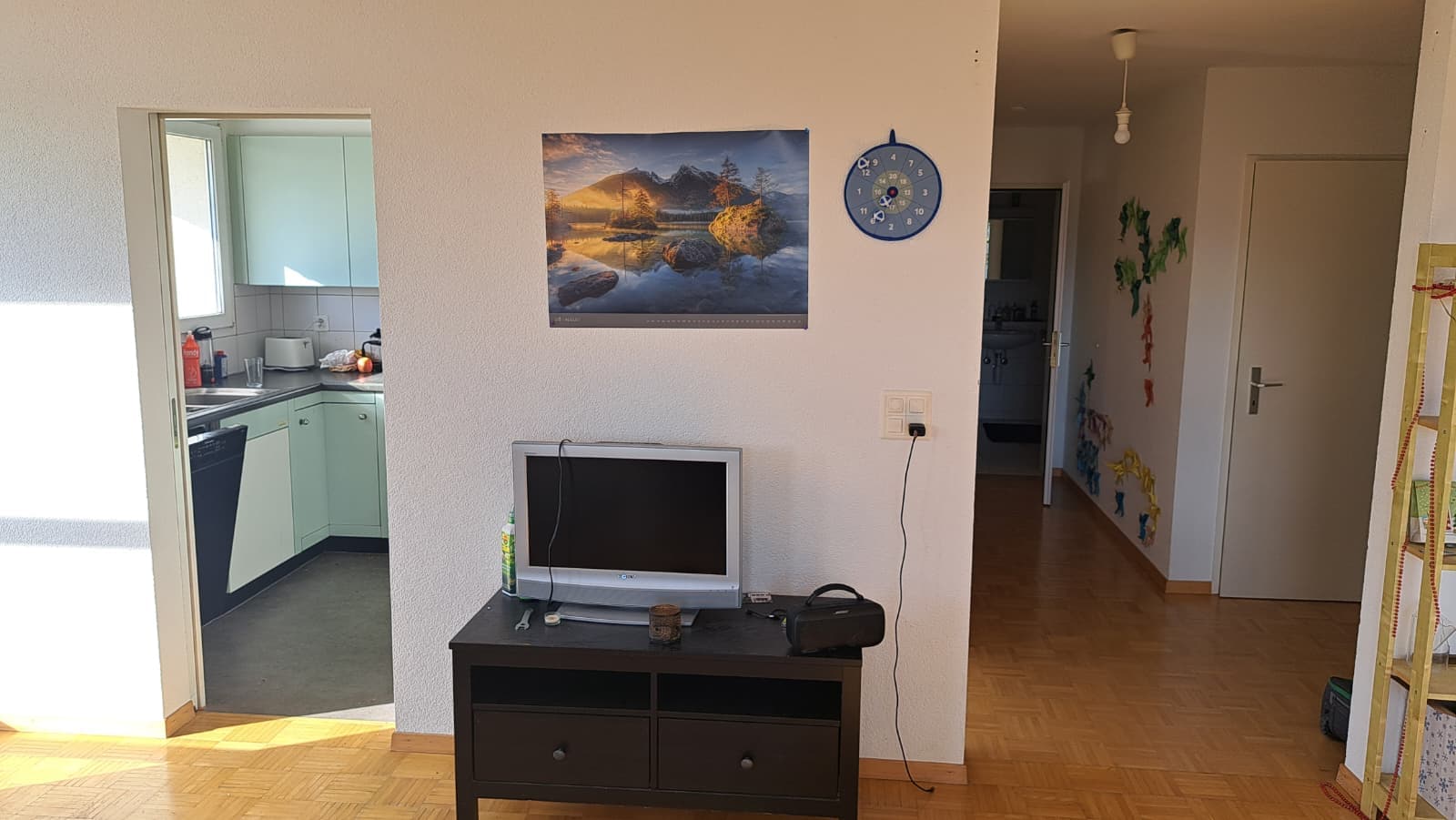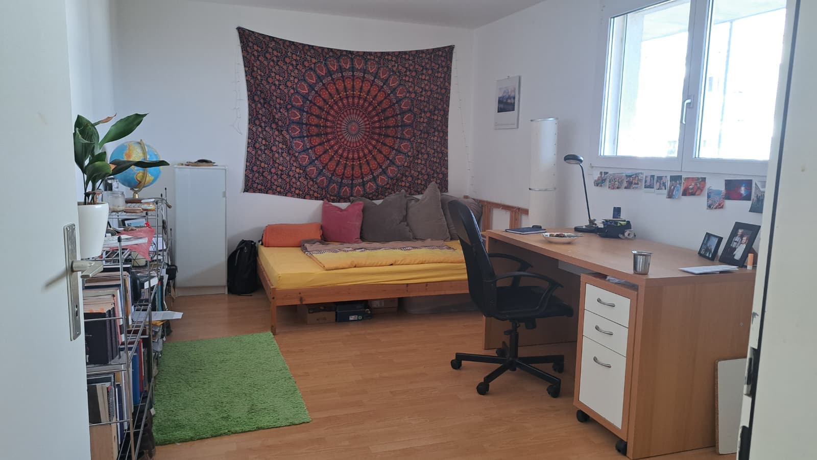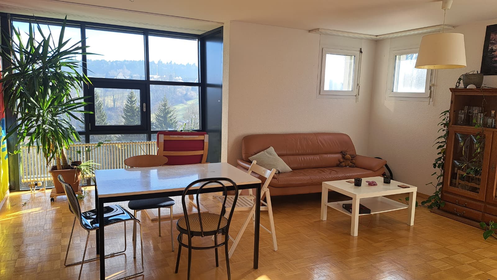 The room has 16qm and view down to the lake of constance on nice days. The whole flat is 98qm with large common living area, two bathrooms and laudry room in the basement. The kitchen is open to the living area, but could be seperated by a sliding door. Overall this creates a very large, lightful common area, with a great view and a balcony on top.