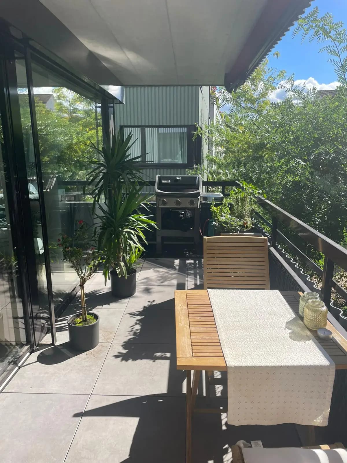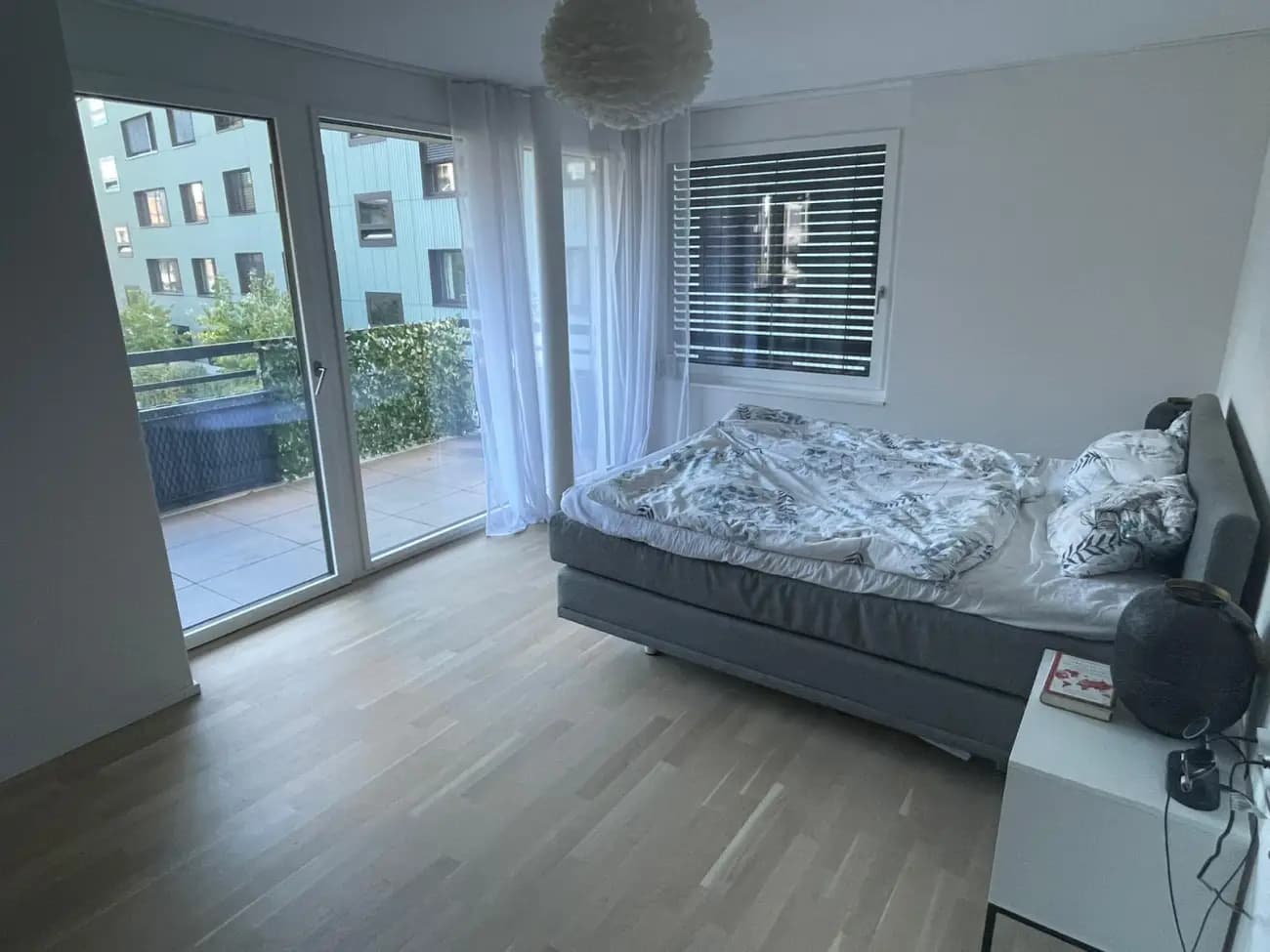 Die Wohnung ist modern, gehoben ausgestattet (Baujahr 2022) und gut geschnitten. Auf beiden Seiten der Wohnung befindet sich jeweils ein 20qm grosser Balkon. Das zu vermietende Schlafzimmer hat einen dieser Balköne für sich mit Lounge.