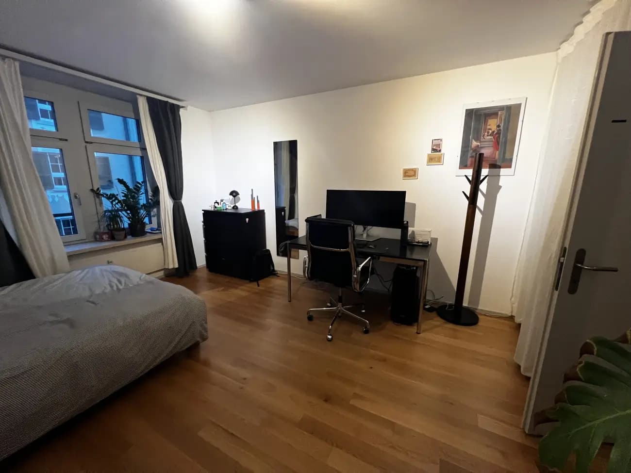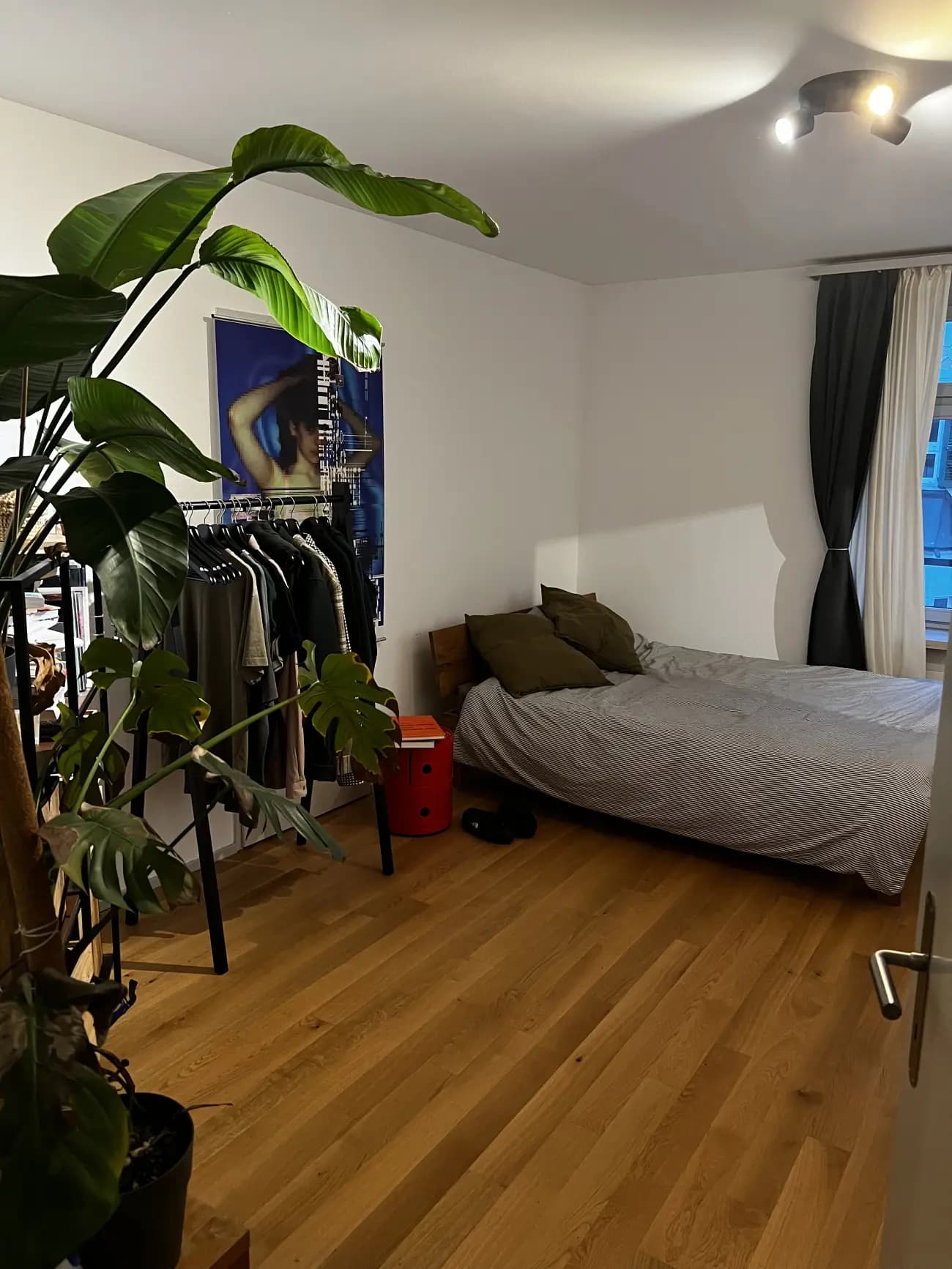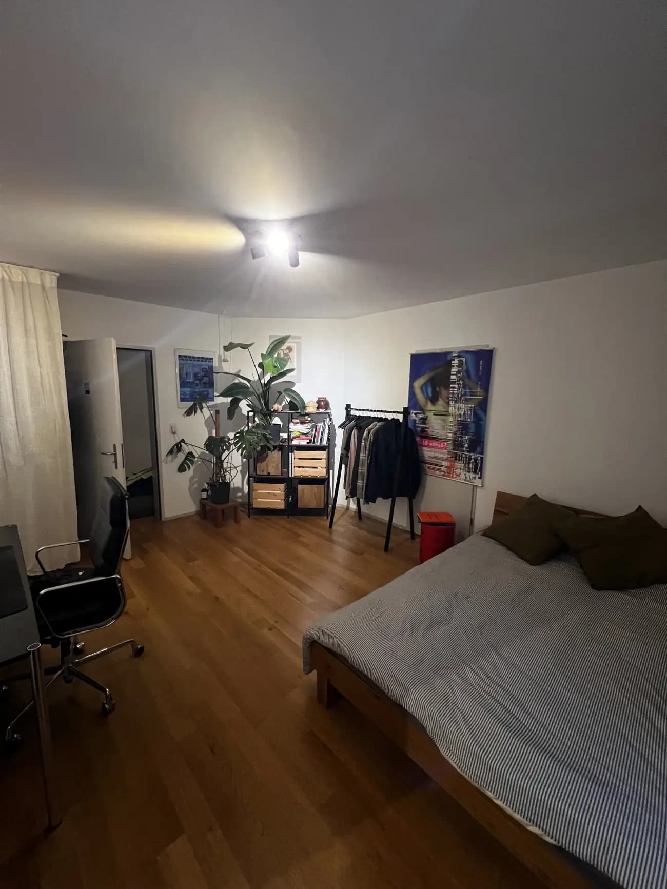 Das Zimmer ist möbliert, das zweitgrösste der WG und komplett ausgestattet, inkl. Arbeitsplatz mit grossem Screen. Die Wohnung bietet eine grosse Küche und eine gemütliche Stube mit Beamer, Klavier, Boxen und einer kleinen Bar.