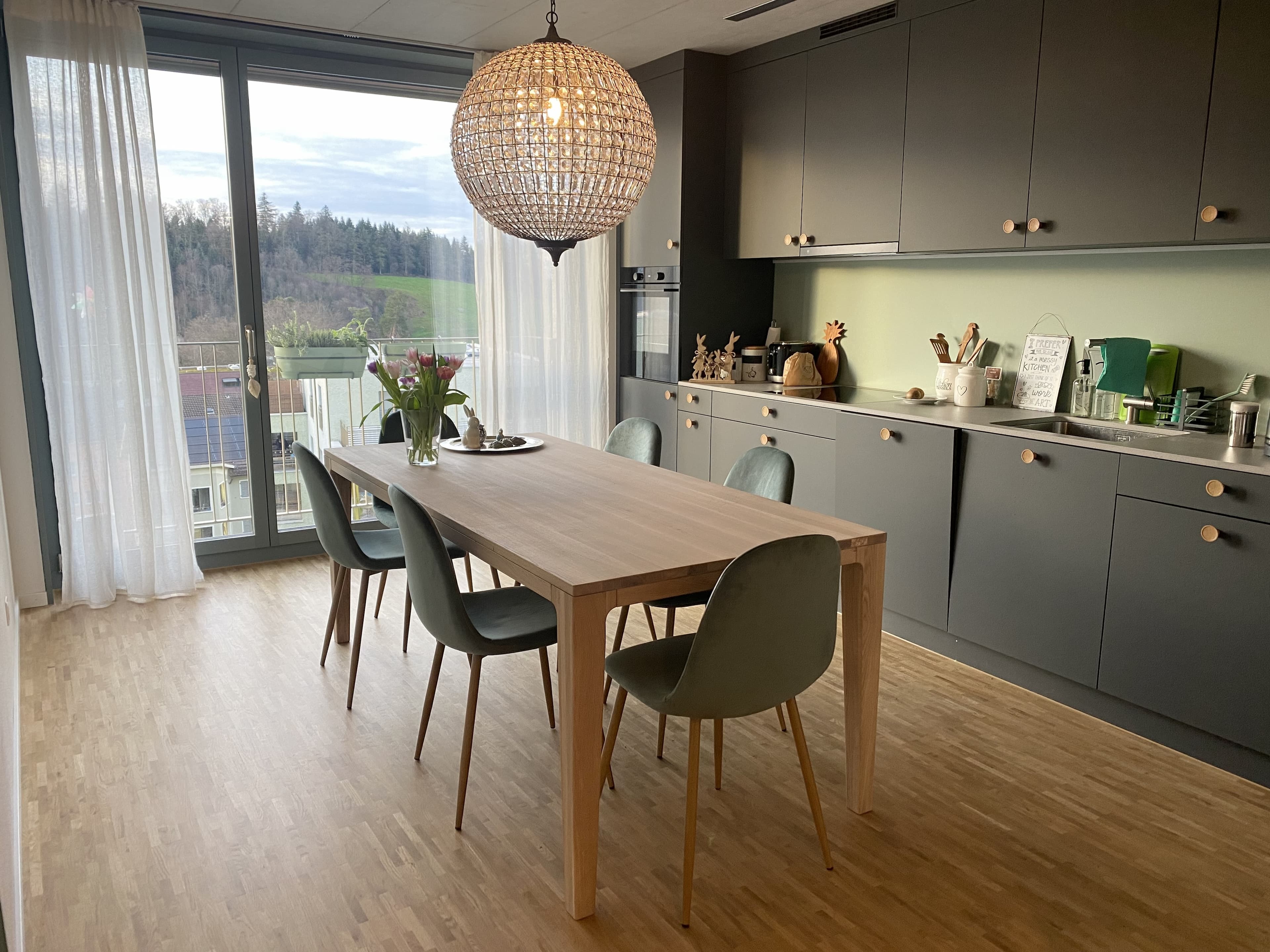 Moderne 3,5-Zimmer-Wohnung, 80 m², komplett möbliert (ausser WG-Zimmer). Grosse, voll ausgestattete Küche, modernes Bad, Reduit und grosser Keller für genügend Stauraum. Highlight: eine grosszügige Loggia mit Waldblick. Ruhiges Quartier.