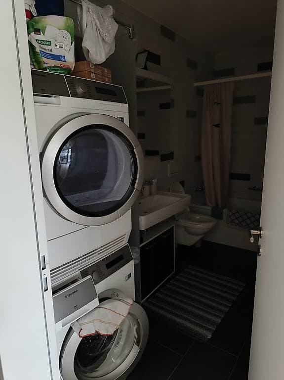 \- ein Badezimmer mit Waschmaschine und Trockner