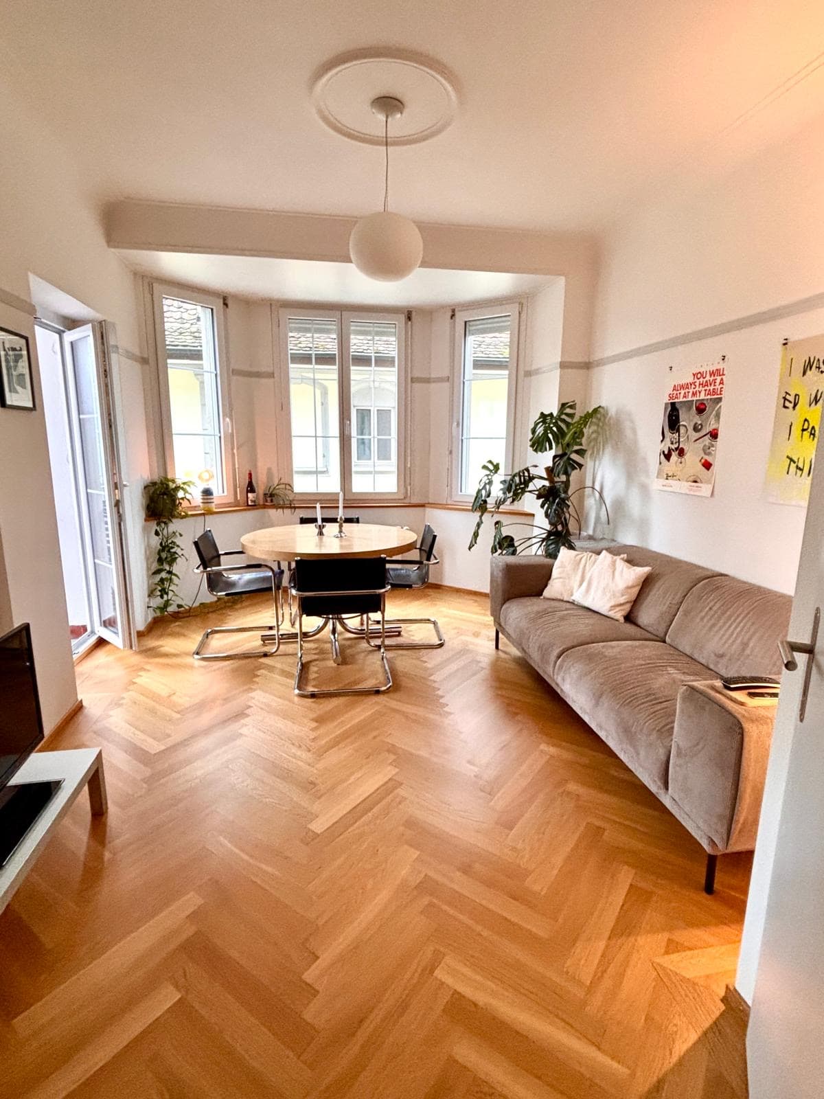 – Die Wohnung befindet sich in unmittelbarer Nähe zum Schaffhauserplatz. – Sie wurde vor ein paar Jahren vollumfänglich renoviert (insb. neue Küche, neues Bad, gute Fenster), wobei der Altbau-Charme erhalten blieb (hohe Decken, Stuckatur, Fischgrät-Parkett, etc.). – Dein WG-Zimmer wäre 19.2 m2 gross. – Die Waschküche ist zur Mitbenützung (ohne Waschplan, sehr easy).