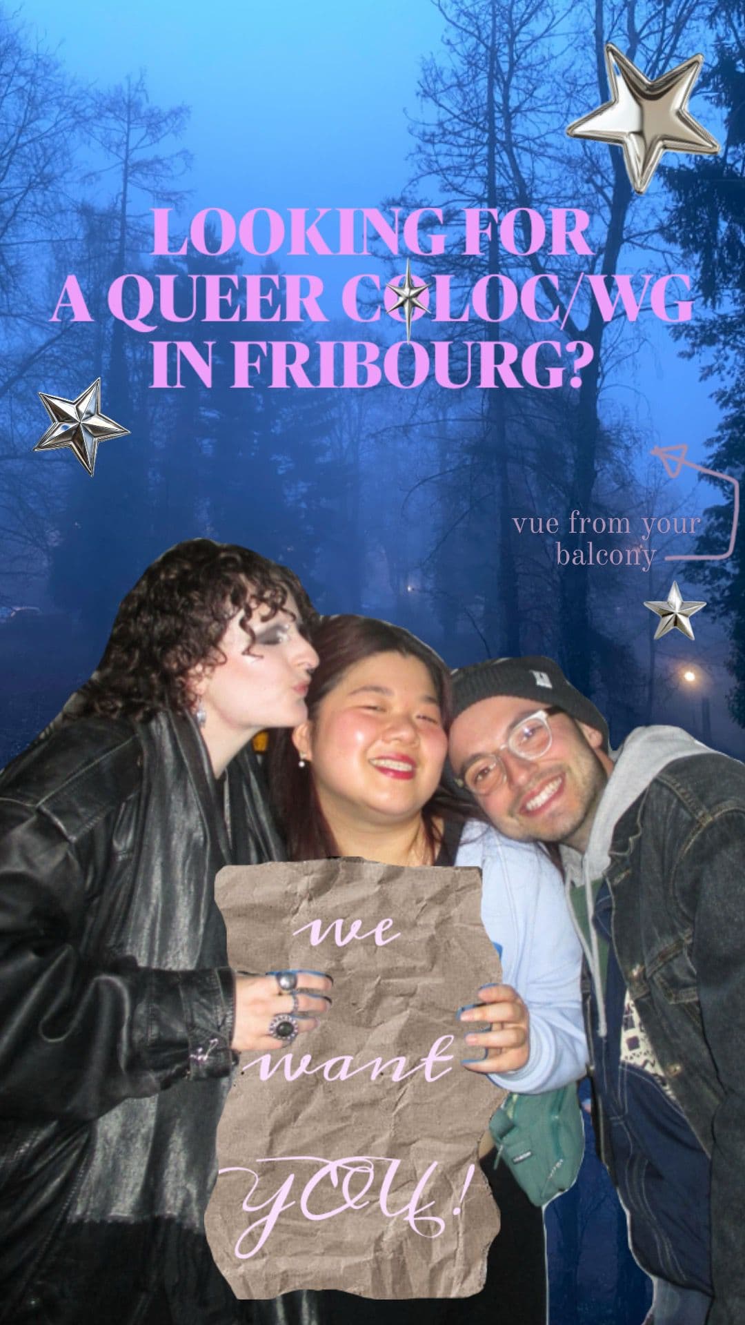 Wir sind gerne zusammen kreativ und machen Kunst, Musik, Aktivismus etc. Wir gründen bald ein Dragkollektiv. Ausserdem lieben wir es, gemeinsam Zeit in der Natur zu verbringen. Sauberkeit, offene Kommunikation und individuelle Rückzugszeit liegen uns am Herzen.