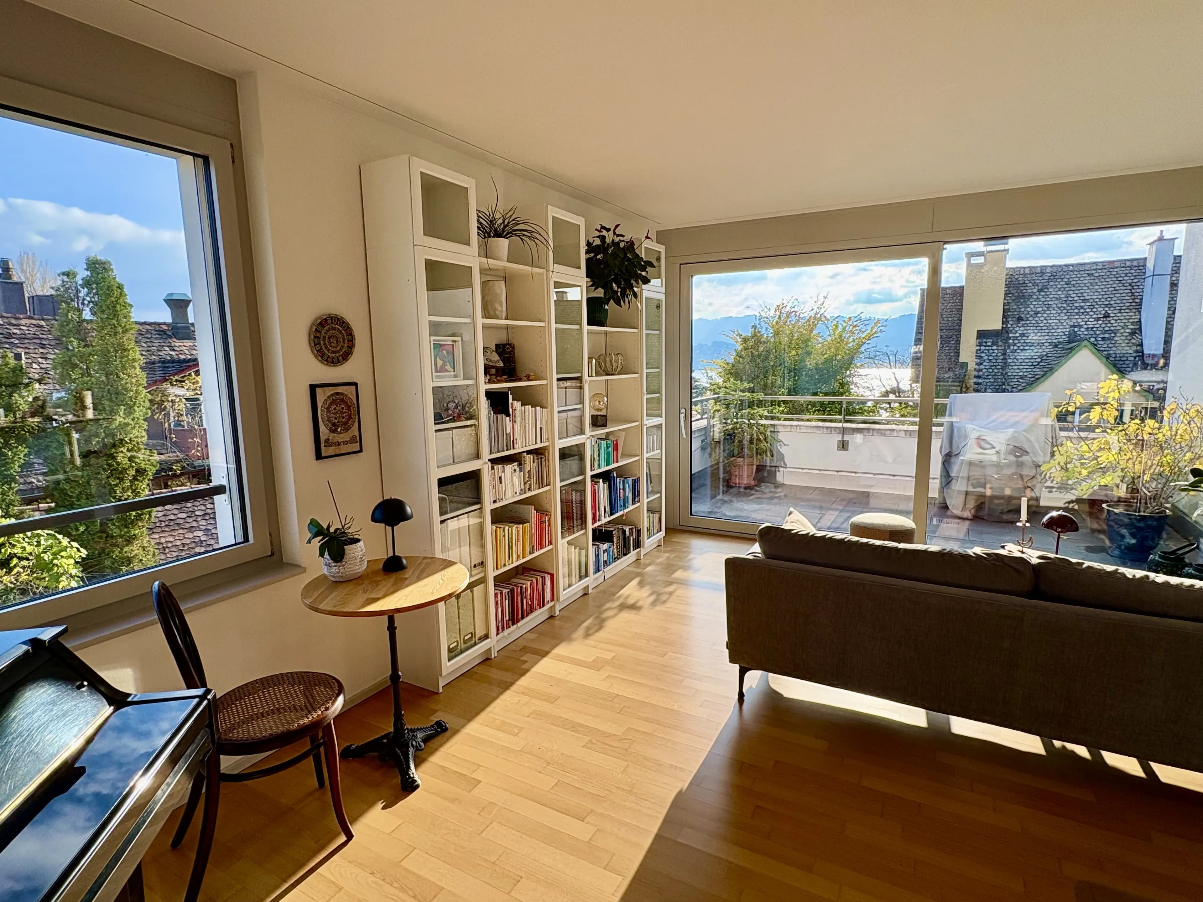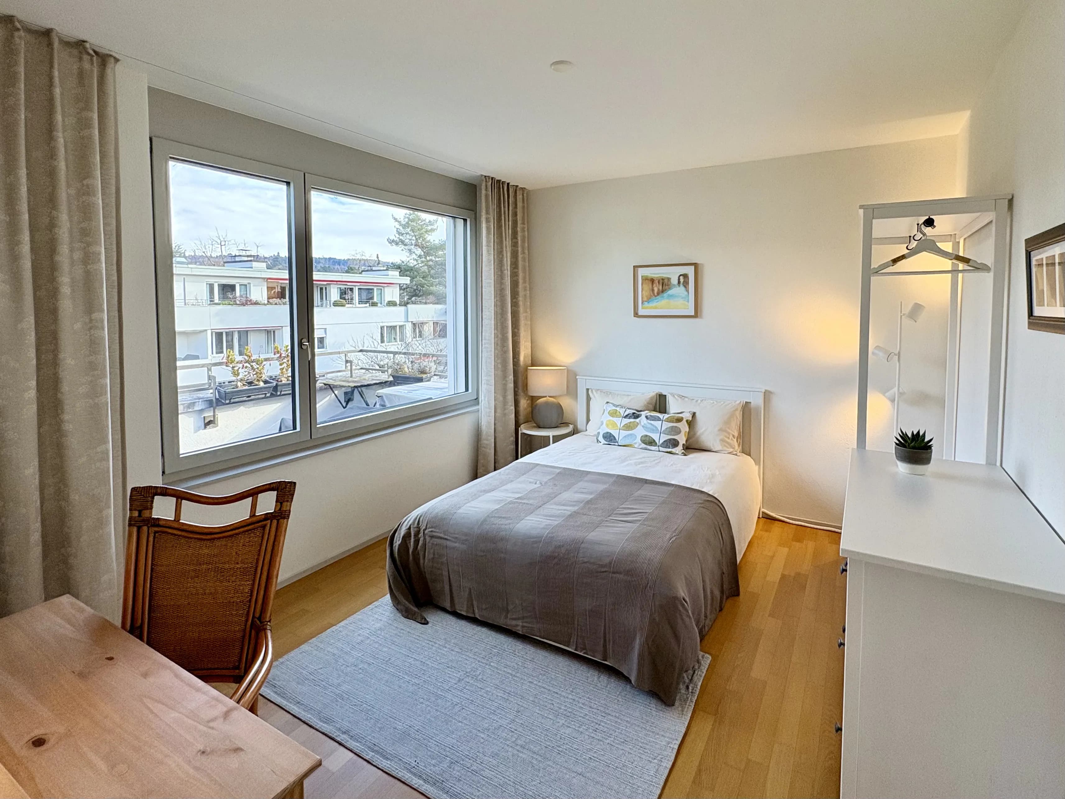 Helles, neu möbliertes Zimmer mit eigenem Bad inklusive Badewanne, in geräumiger und moderner 3,5-Zimmer-Wohnung mit Seeblick und herrlicher Abendsonne. Verbindet hervorragende Anbindung an die Stadt mit ruhiger Wohnatmosphäre - perfekt zum Entspannen nach einem arbeitsreichen Tag. Sofort verfügbar.