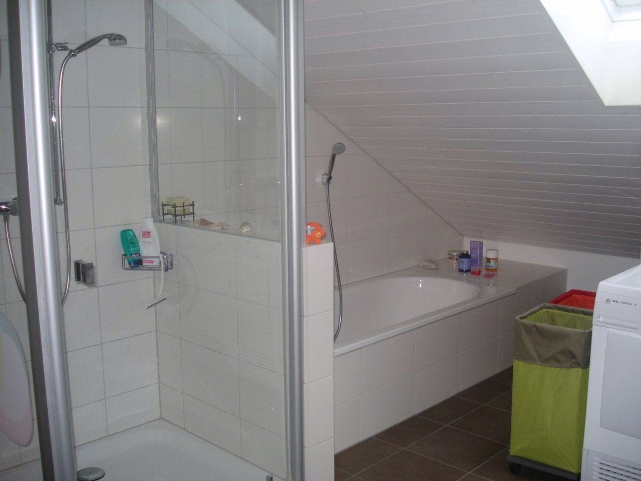 Unsere 3er-WG (mit dir dann) verfügt über zwei Badezimmer. Du bekommst auf jeden Fall einen eigenen Spiegelschrank, und wenn du möchtest, kannst du auch das Badezimmer mit Dusche direkt neben deinem Zimmer für dich allein nutzen.