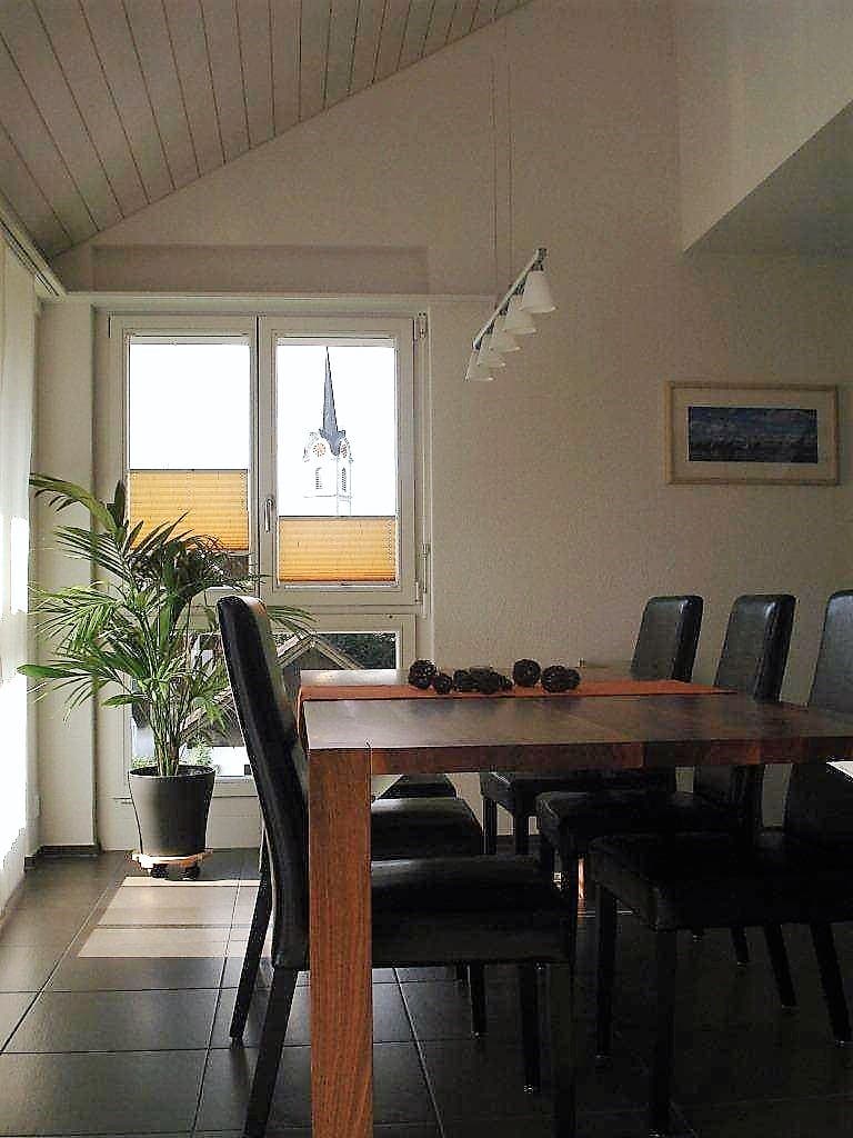 Die Maisonette-Wohnung hat ein grosszügiges, offenes Wohnzimmer mit Essbereich und moderner Küche. Im oberen Stock stehen uns eine eigene Waschmaschine und ein Tumbler zur Verfügung. Zusätzlich gibt es ein Reduit für Vorräte sowie einen grossen Gefrierschrank zur gemeinsamen Nutzung. Auf dem Balkon findest du ein paar Pflanzen, Liegestühle und im Sommer sogar eine Hängematte – perfekt zum Entspannen.