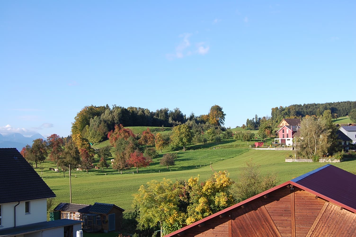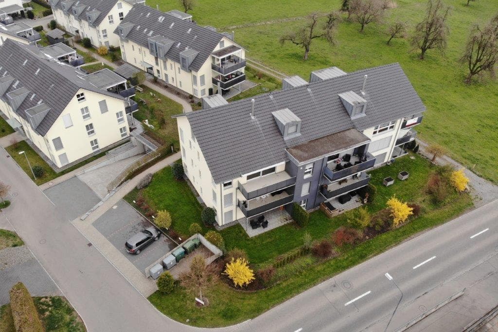 Die Wohnung befindet sich im zweiten Stock und ist bequem mit dem Lift erreichbar. Wir leben am Rand des kleinen Dorfs Abtwil, in einem ruhigen Wohnquartier mit viel Grün rundherum.