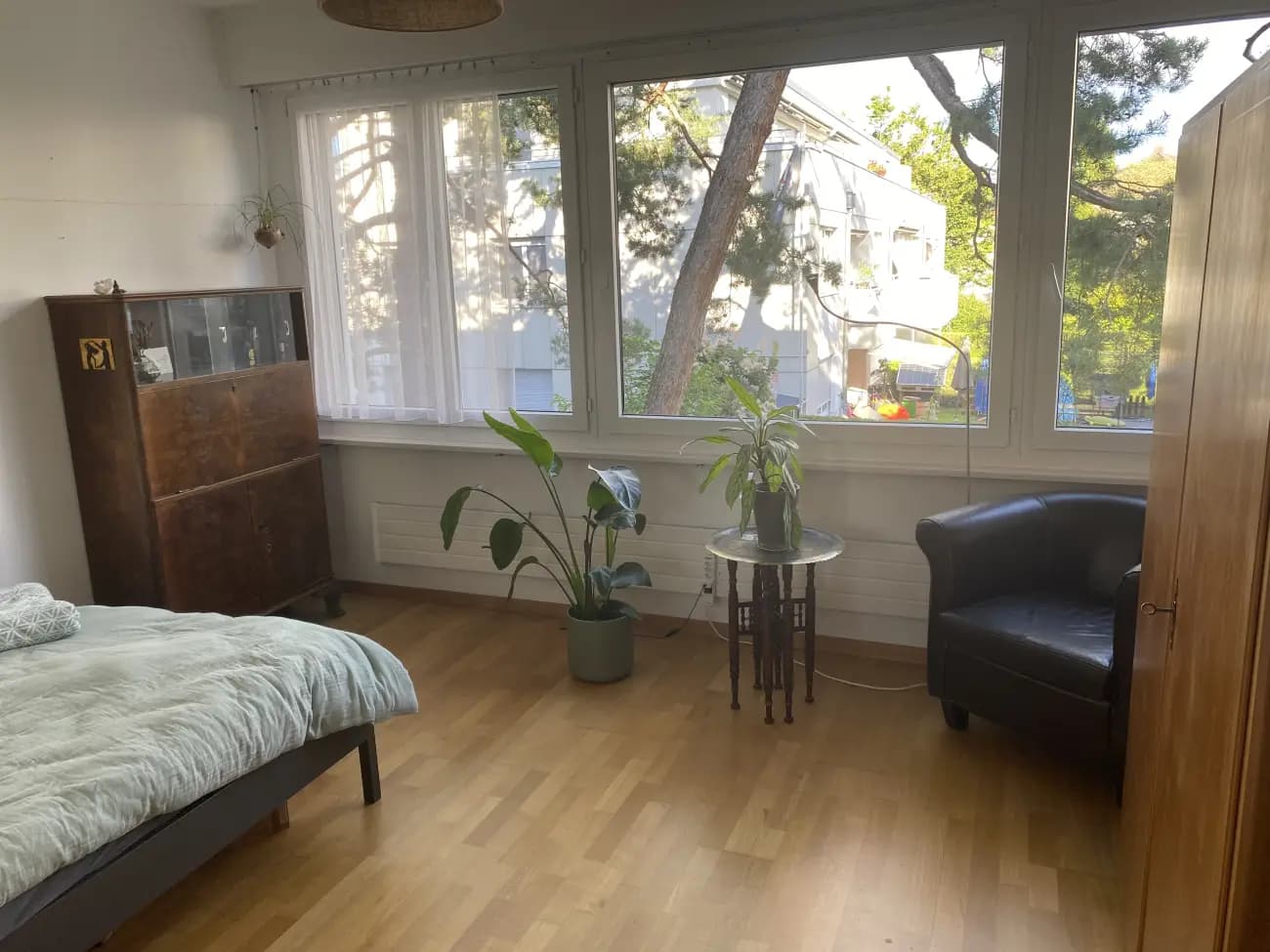 Das Zimmer verfügt über einen Parkettboden und eine grosse Fensterfront.