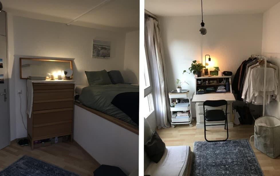 d: Das Zimmer ist mit 9m2, klein aber fein. Es befindet sich auf der Nordseite der WG und ist dadurch besonders ruhig. Durch die Empore, welche die Schlafecke bildet, ist das Zimmer einzigartig. Das Zimmer wird ab Mitte April frei (oder nach Vereinbarung). Unsere WG ist ein Haus mit drei Etagen, bestehend aus 6 Schlafzimmern, einem Badezimmer mit Badewanne und WC und einem weiteren WC. Unsere Küche ist komplett ausgestattet (inkl. Geschirrspüler). Ausserdem haben wir ein gemütliches Wohnzimmer inkl. Esstisch und eine grosse Terrasse mit Grill, Hängematte, gemütlicher Lounge und Garten. Im Untergeschoss haben wir einen Vorratsraum, wie auch eine eigene Waschküche mit Waschmaschine und Tumbler. In wenigen Gehminuten ist man im Grünen, wo man wunderbar spazieren oder joggen gehen kann. Bei Interesse schicken wir dir auch gerne noch mehr Fotos von den Zimmern / der WG.