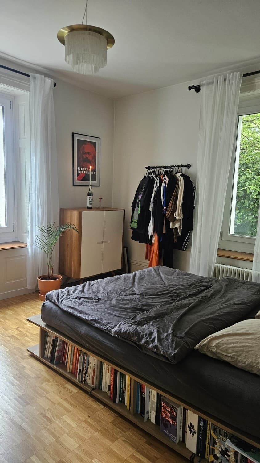 Das Zimmer ist sehr ruhig gelegen, hat Morgensonne und einen Blick auf den Hinterhof. Die Wohnung liegt im Hochparterre und verfügt über einen wunderschönen über 100 Jahre alten Holzboden, ein gemütliches kleines Wohnzimmer mit Beamer und Leinwand, eine offene und gut eingerichtete Küche, ein grosses Bad mit Duschkabine und ein praktisches Reduit.
