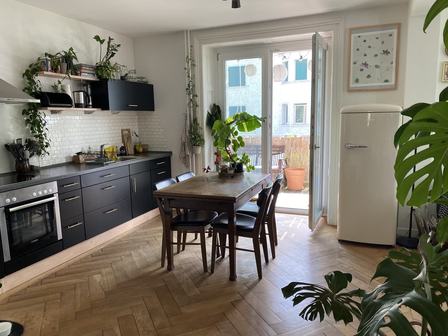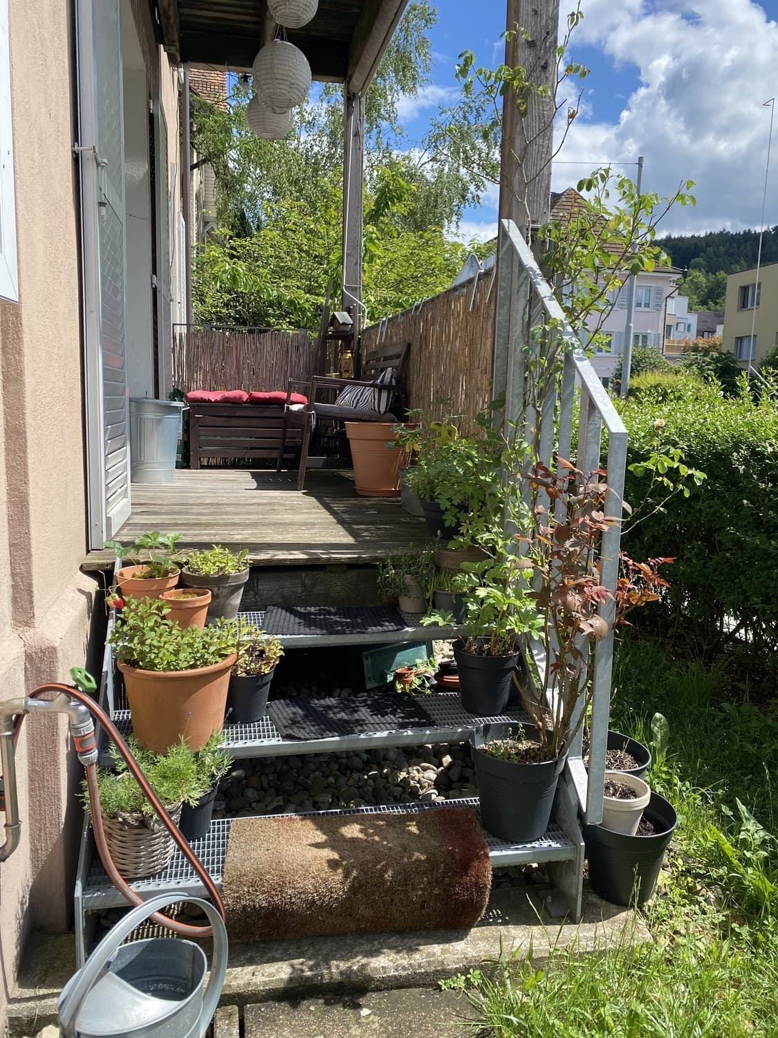 Abwaschmaschine gibt es leider keine, dafür haben wir aber eine eigene kleine Waschküche mit Wäscheturm im Treppenhaus. Nebst dem Balkon gehört auch ein kleiner Garten mit Feuerschale, Paletten-Lounge und drei Hochbeeten zur Wohnung. Leider ist die Strasse an der unsere Wohnung liegt etwas stark befahren, aber ausserhalb der Hauptverkehrszeiten kann man ganz toll Zeit im Garten und auf dem Balkon verbringen.
