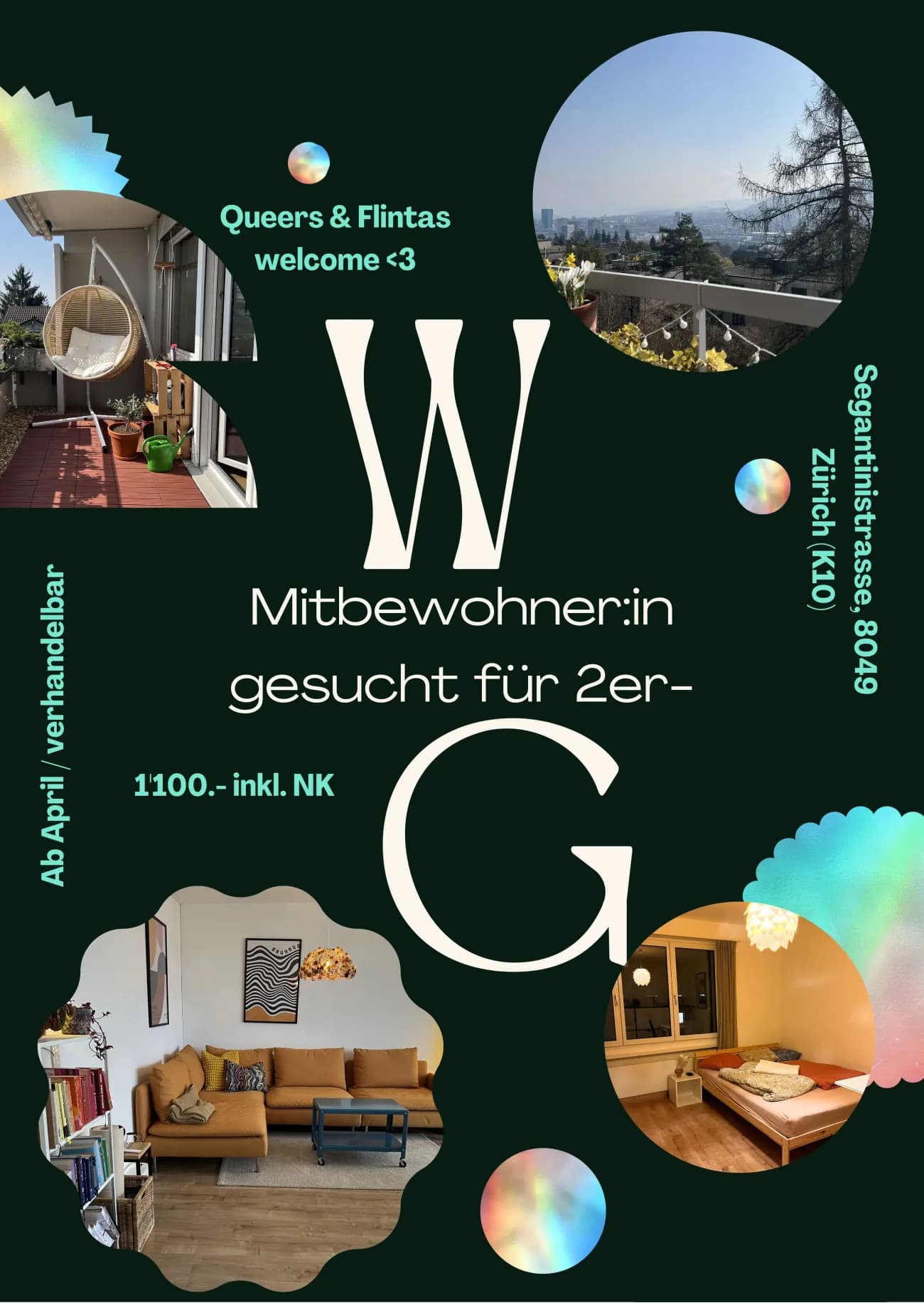 Am liebsten würde ich das Zimmer schon im April irgendwann vermieten - ultra spontan i know. Wir können auch über späteren Start reden😌 Schreib mir bei Interesse (silvia.staub@gmx.ch) & sonst pls share! Thanksss, Silvia