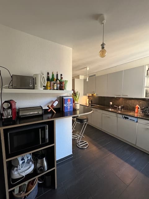 Die Wohnung ist in einem Altbau und hat daher hohe Räume (mit Stuck an der Decke und Holzvertäfelung an den Wänden). Sie ist neu renoviert und hat eine sehr moderne Küche. Die Waschmaschine und der Tumbler sind zur Mitbenutzung im Keller (ohne Waschplan - funktioniert super).