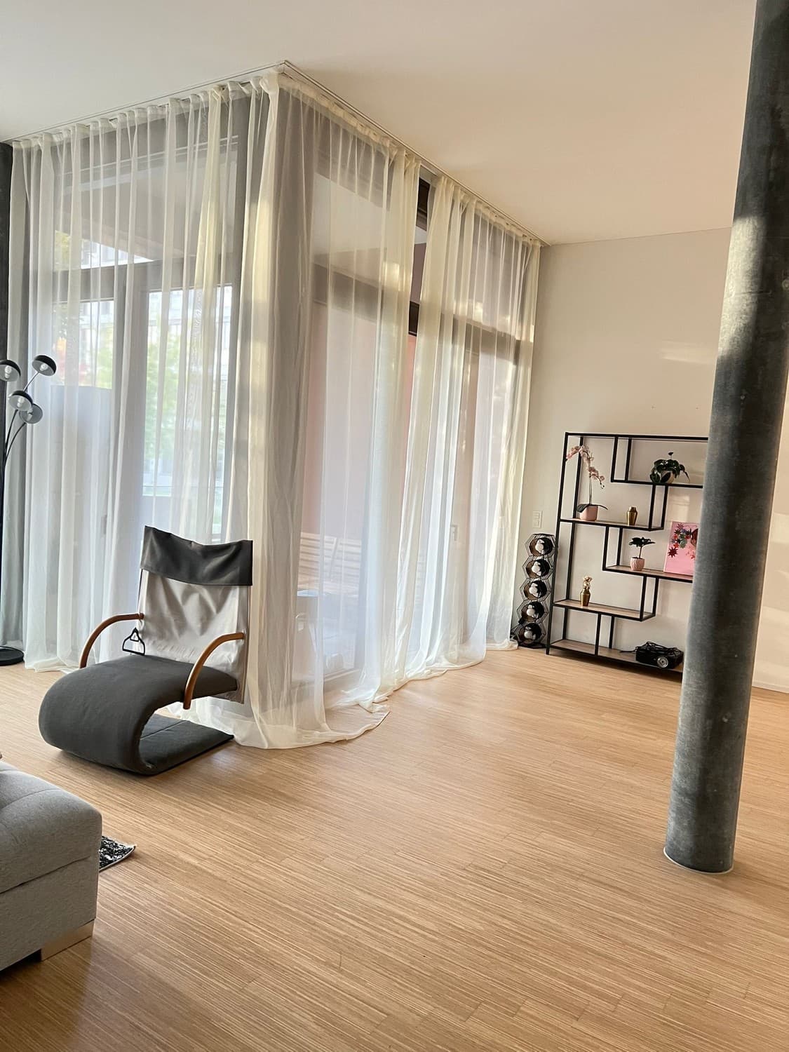 Gemeinschaftsbereich: Großzügiges Wohnzimmer mit 3,5 m Deckenhöhe, offene Küche mit Geschirrspüler und Backofen, Balkon mit gemütlichem Ecksofa