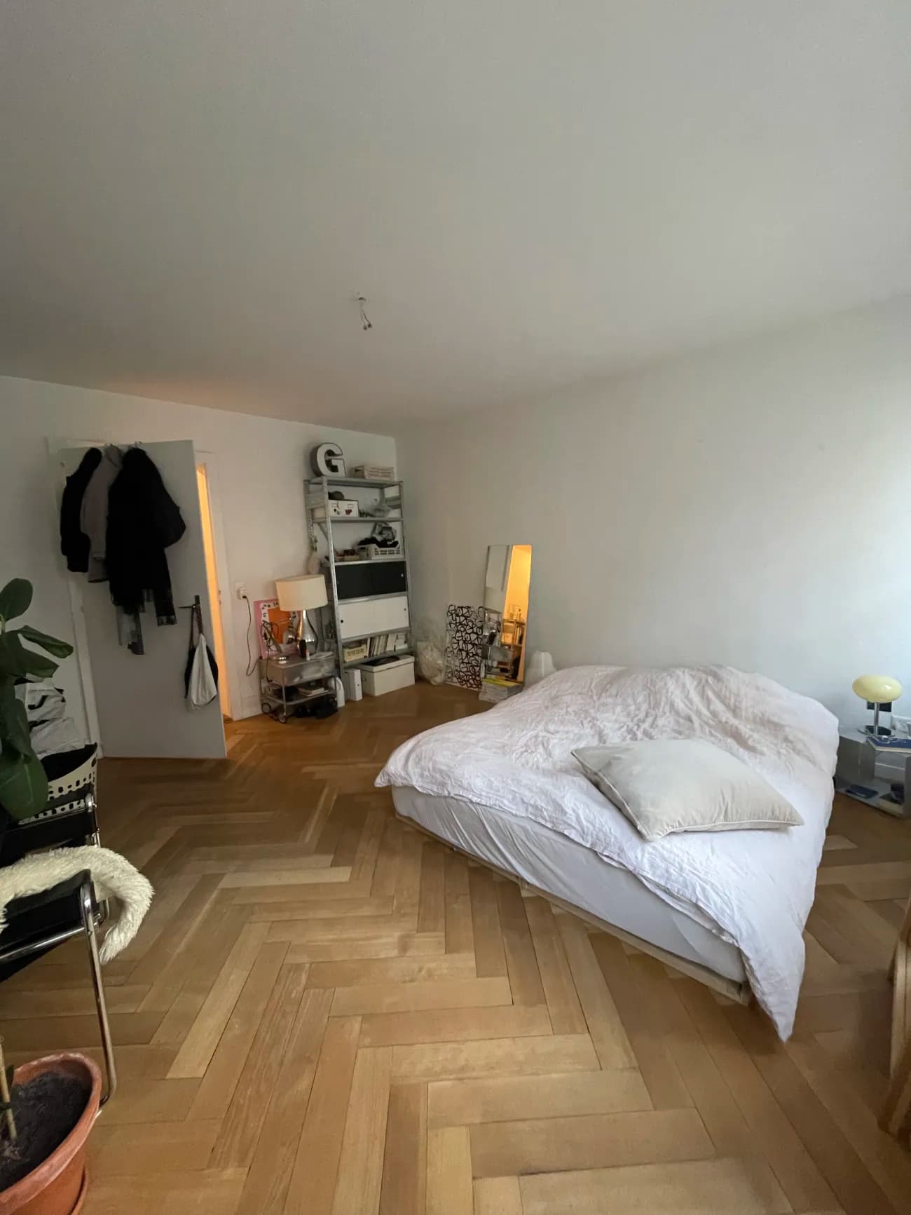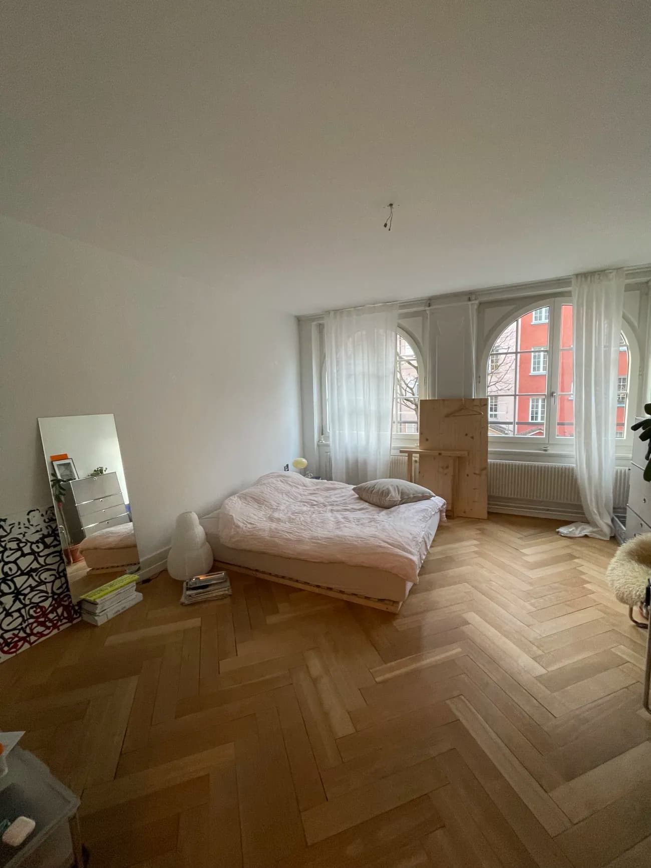 Das Zimmer ist ca. 18 m² gross, verfügt über zwei Fenster und ist dadurch sehr hell und lichtdurchflutet. Der schöne Fischgrätenboden verleiht dem Raum zusätzlichen Charme. In der Küche gibt es einen kleinen Balkon, und das Badezimmer wird gemeinsam genutzt.