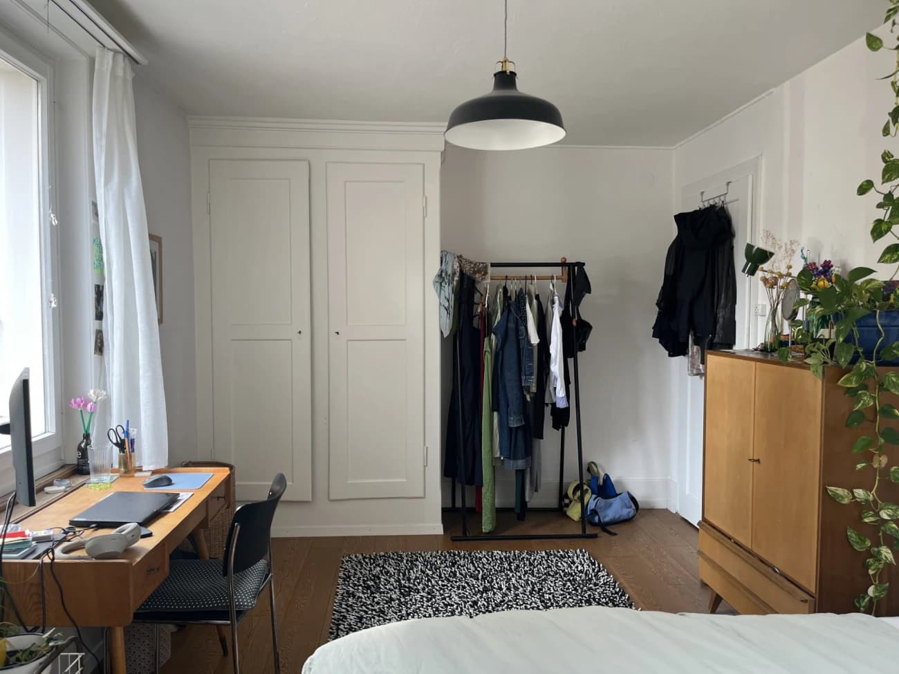 Das gemütliche Zimmer ist ca. 15 m² gross, hat zwei geräumige Einbauschränke und zwei Fenster und ist dadurch sehr hell. Das Zimmer ist unbefristet und ab sofort oder spätestens ab Anfang Mai verfügbar.