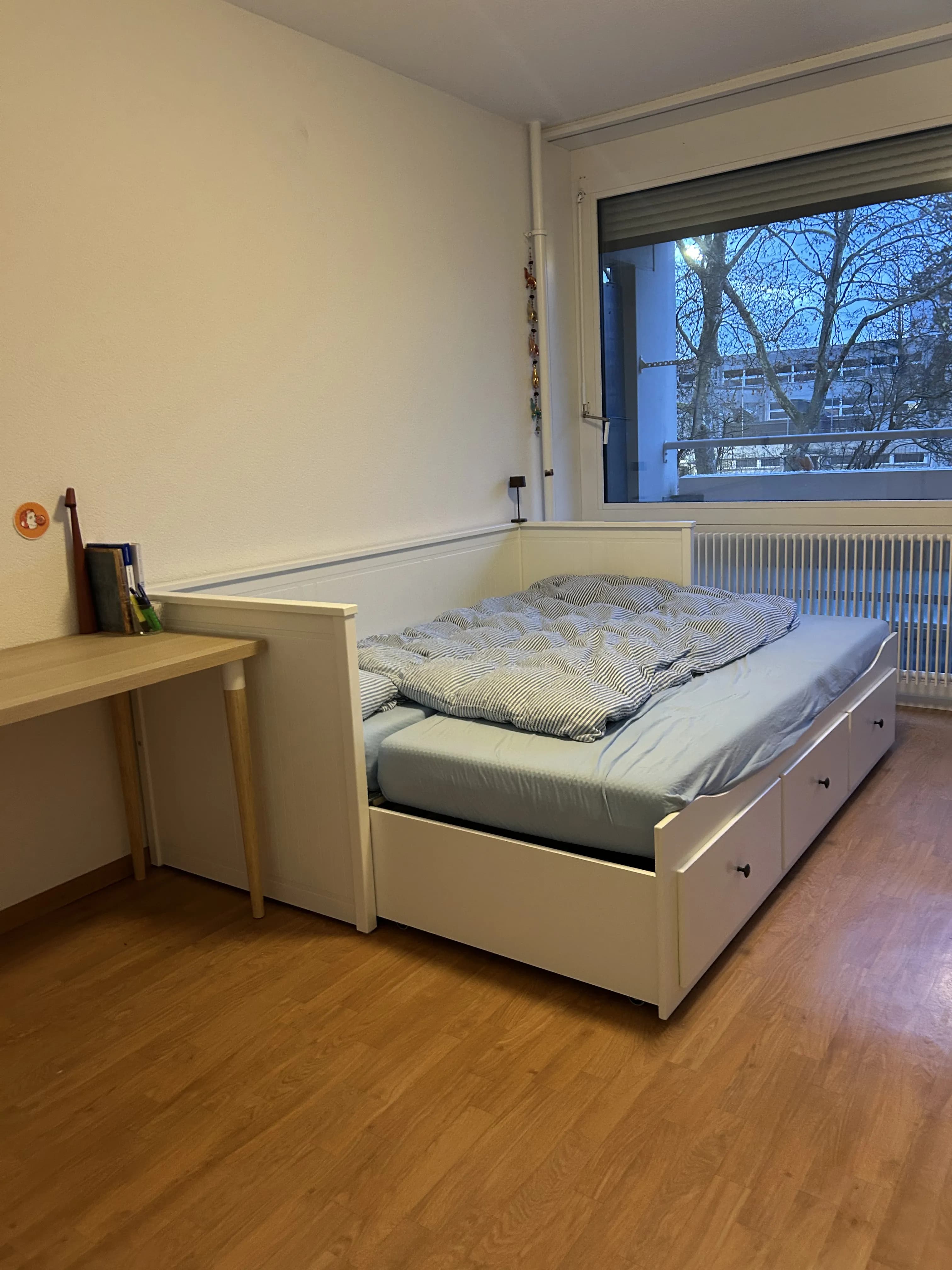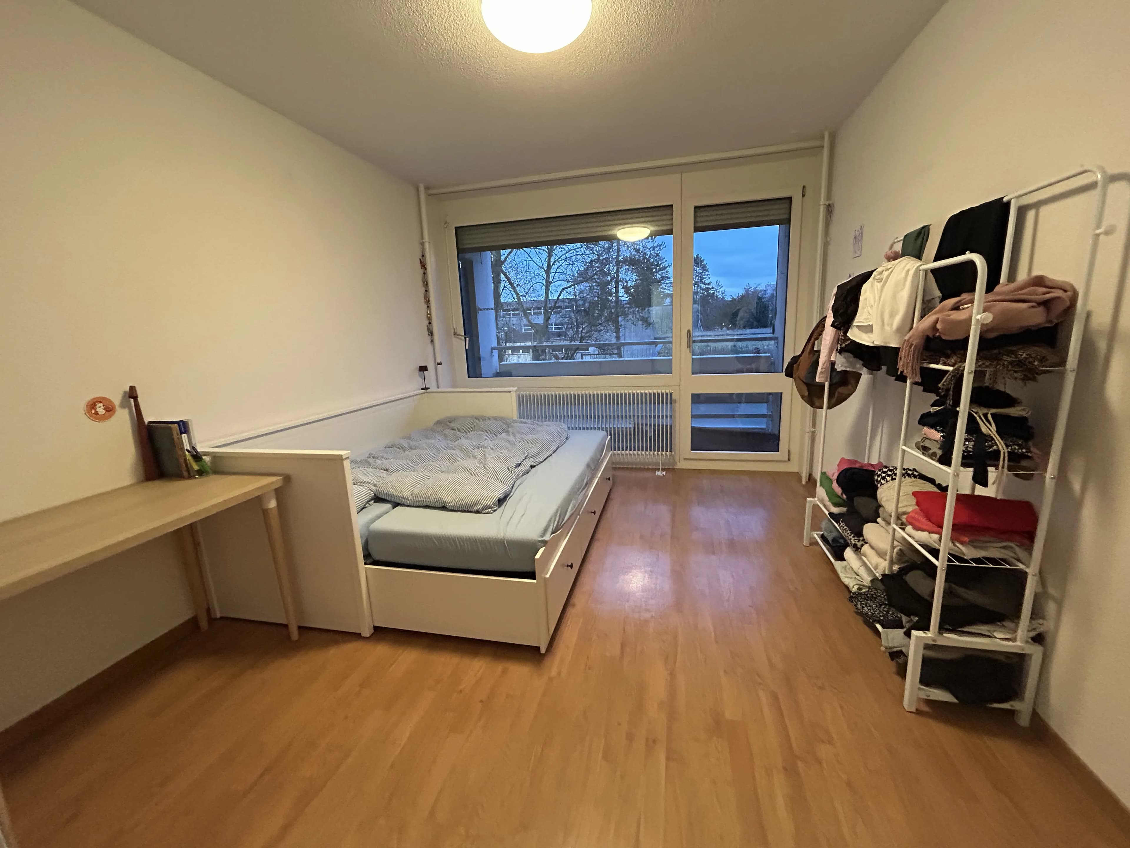 Ca. 12qm großes und sehr helles Zimmer mit Balkon Richtung Süd-west. Holzlaminat und Verdunkelungsrollo. Sehr gerne würde ich auch das IKEA Hemnes Bett mit zwei Matratzen, Kleiderstange und Schreibtisch verkaufen für 270 CHF verkaufen. Die Wohnung hat einen großen geräumigen Flur, 1,5 Bäder (Badewanne und Dusche), Abstellkammer, Küche und ein großes Wohnzimmer mit einem weiteren Balkon. Im Keller kann gewaschen werden.