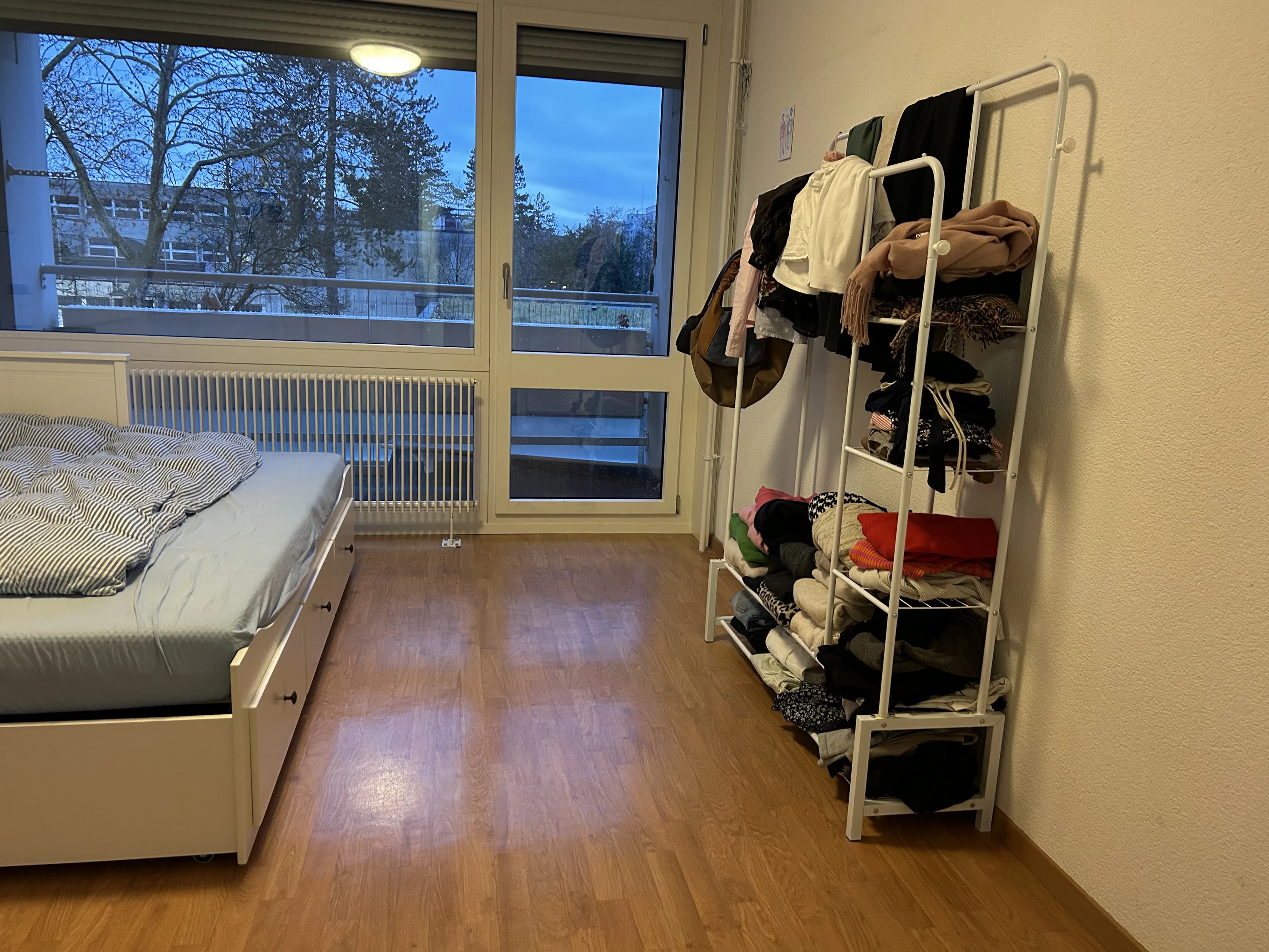 I would also be happy to sell the IKEA Hemnes bed with two mattresses, a clothes rack, and a desk for 270 CHF.
